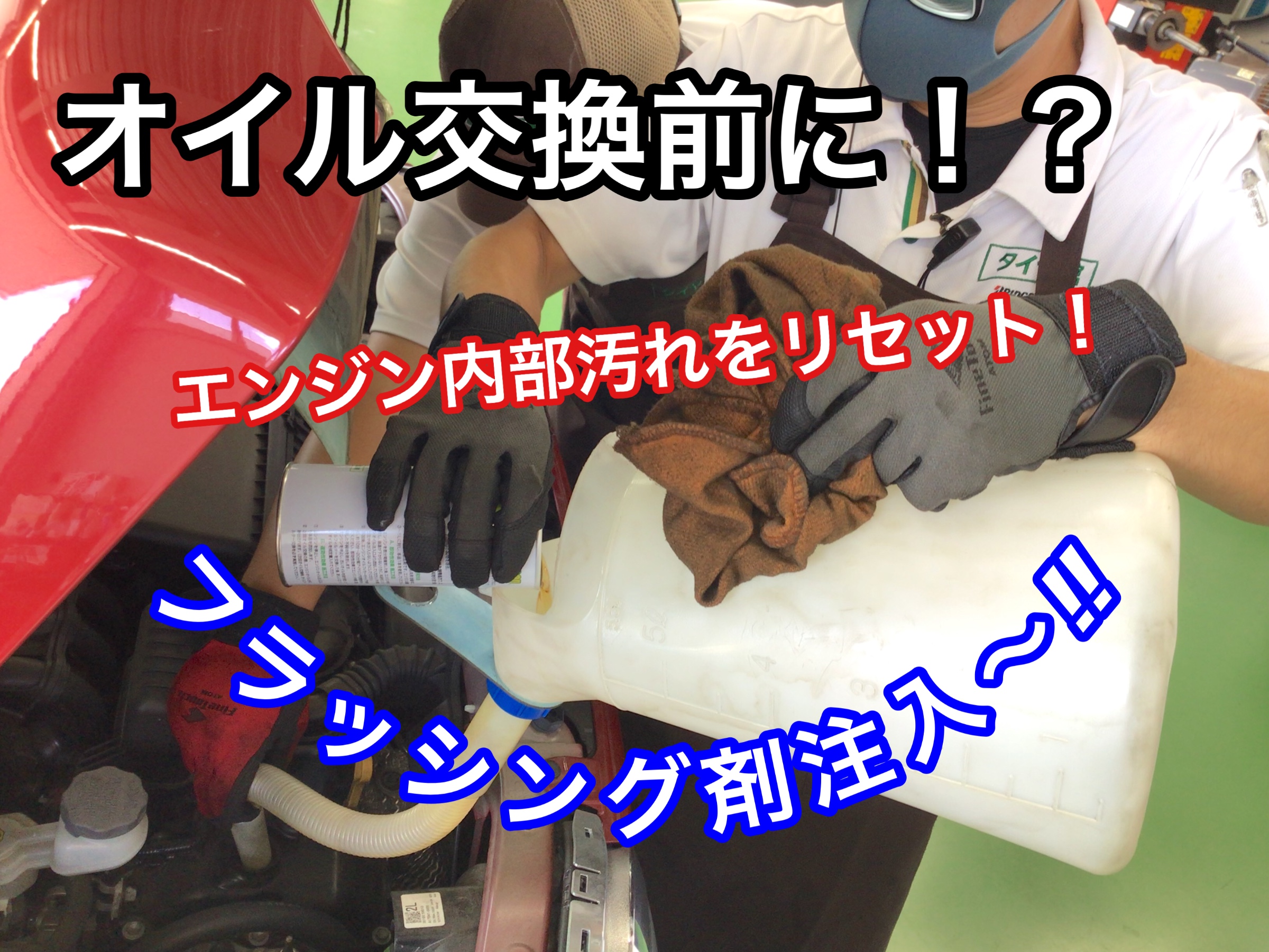 ★フラッシング実施なのでオイルを抜く前に、洗浄剤を加えて数分アイドリングしていきます。
