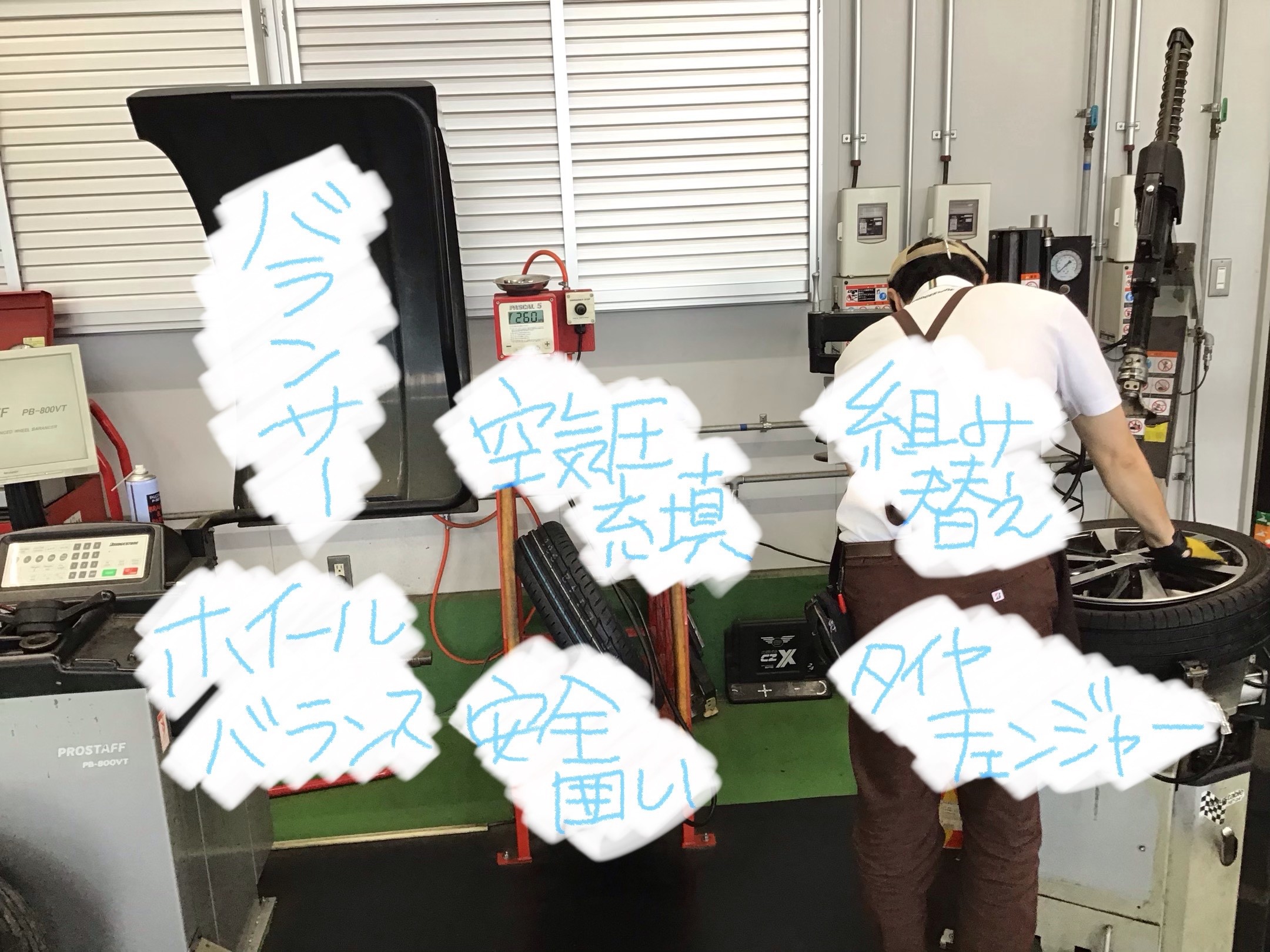 いつも通り、画像右側からタイヤの組み替えを行います。チューブレスバルブの交換やリム掃除等を行い新品タイヤを組み付けます。画像中央の、安全囲いに組み終えたタイヤを入れ、空気圧充填作業!
