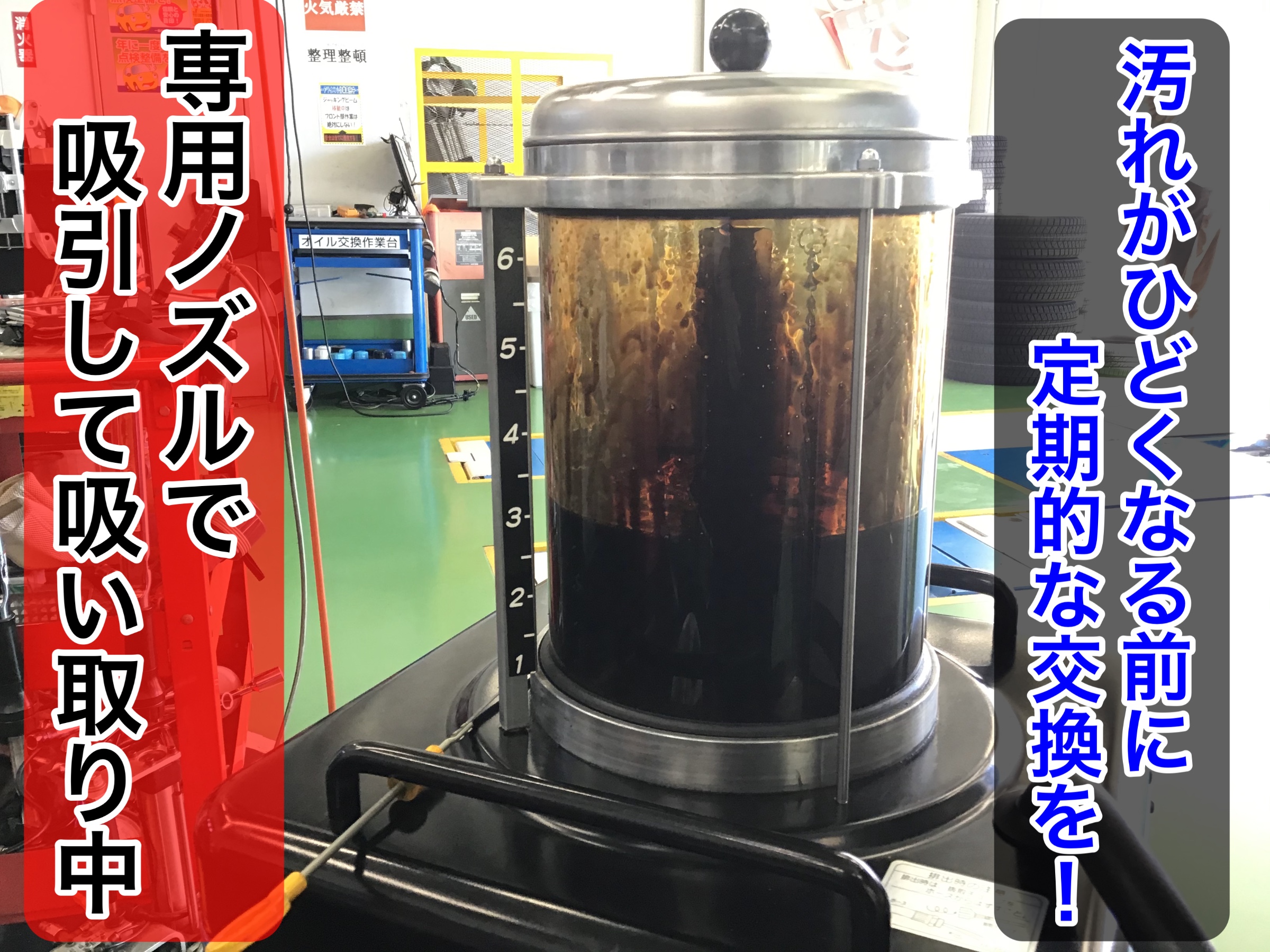 上記写真のように、エンジンオイルを交換する際は基本的に上抜きで実施しております。