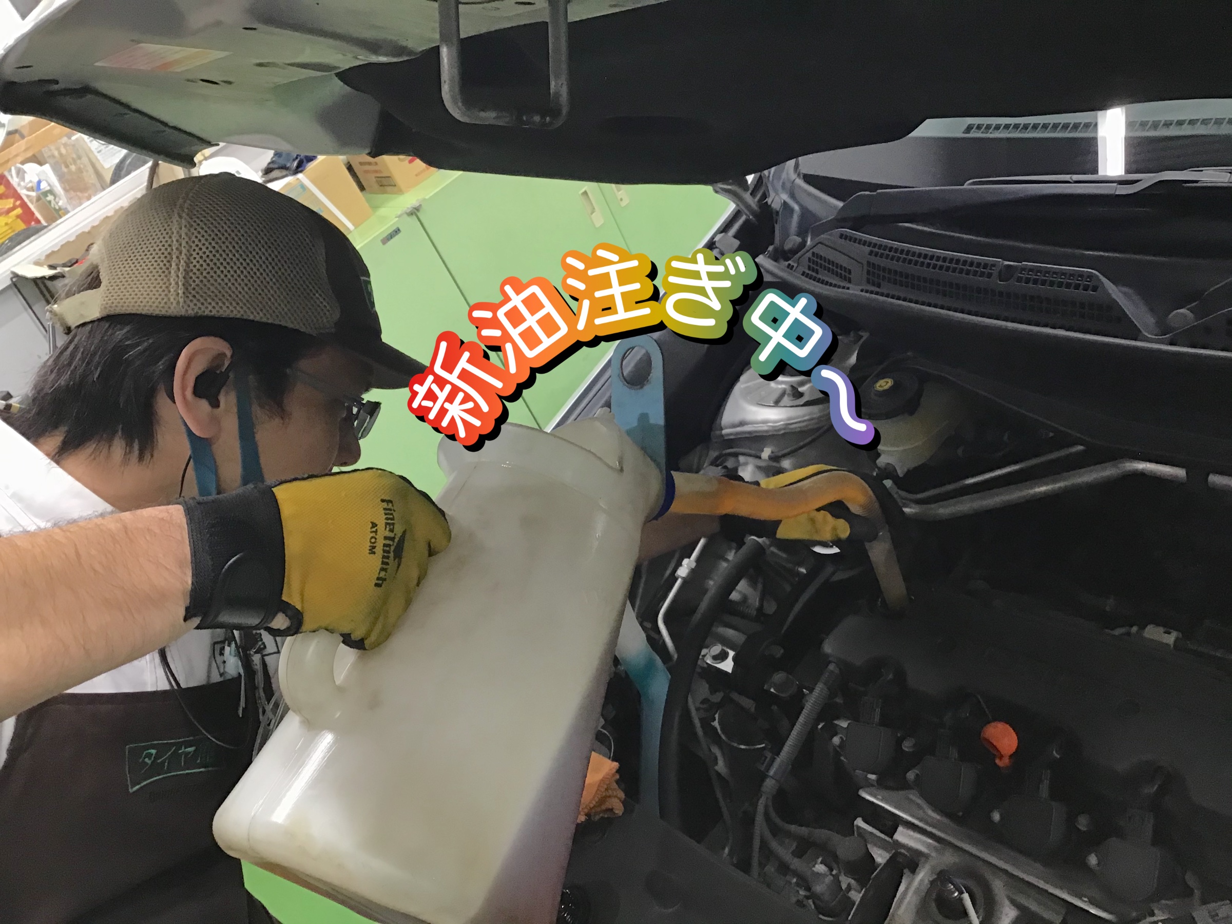 しっかりフィルターの交換と旧油を抜き終えたら、新油を注ぎます