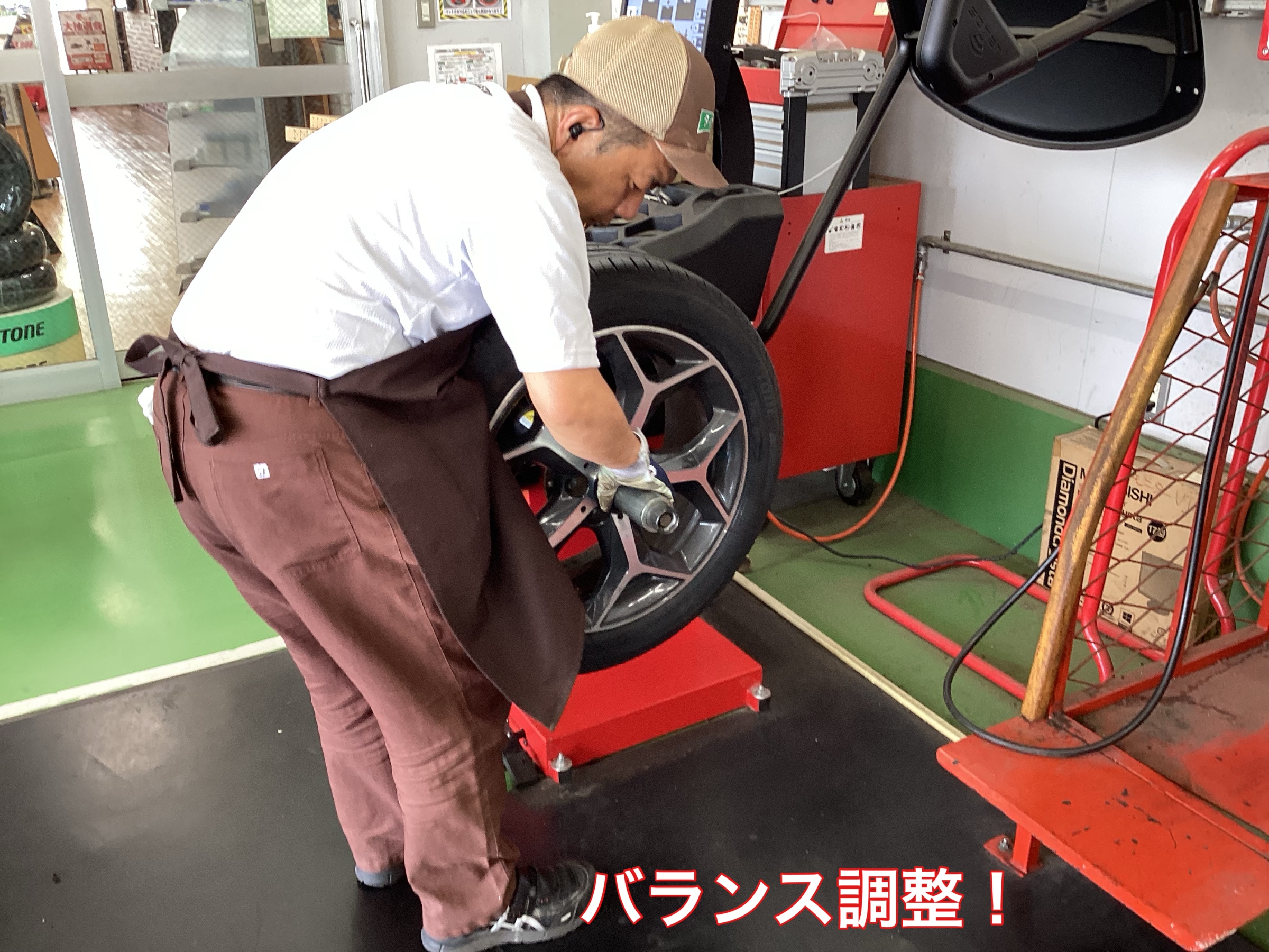 空気充填後は、ホイールバランスを調整します。