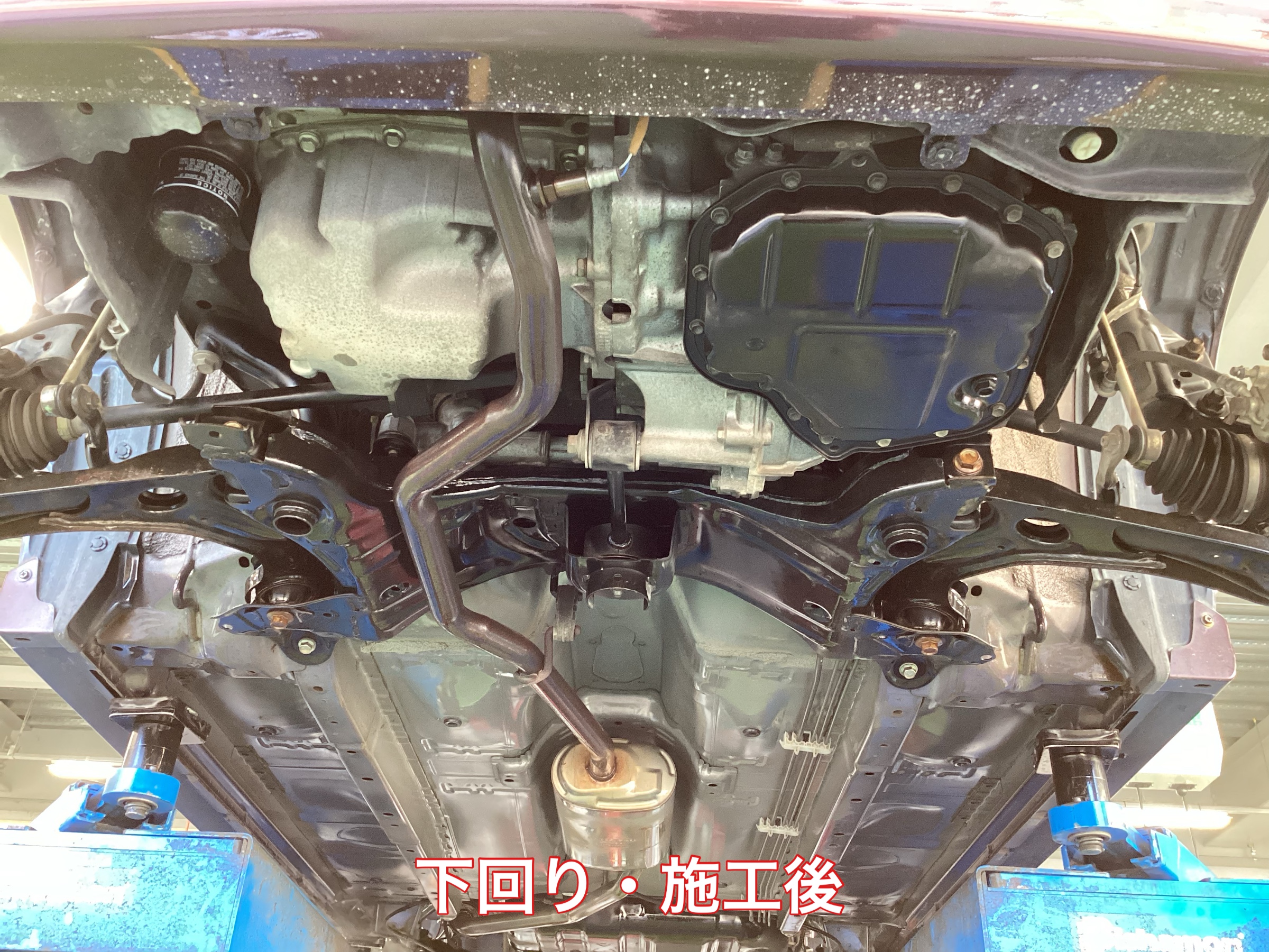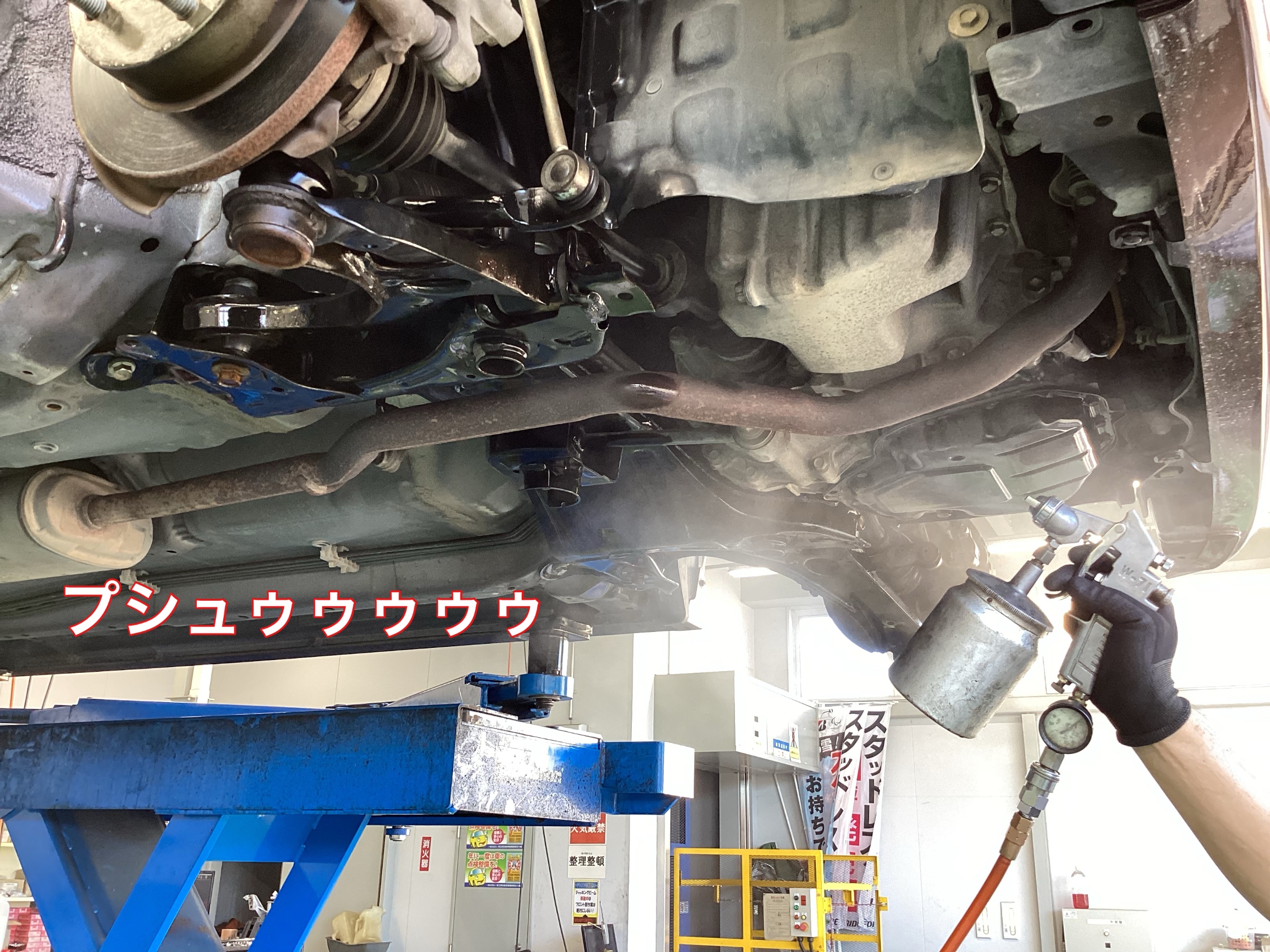 下回りは、磨くという工程はせずに、専用噴射機で「塩カル防錆剤」をコーティングします。