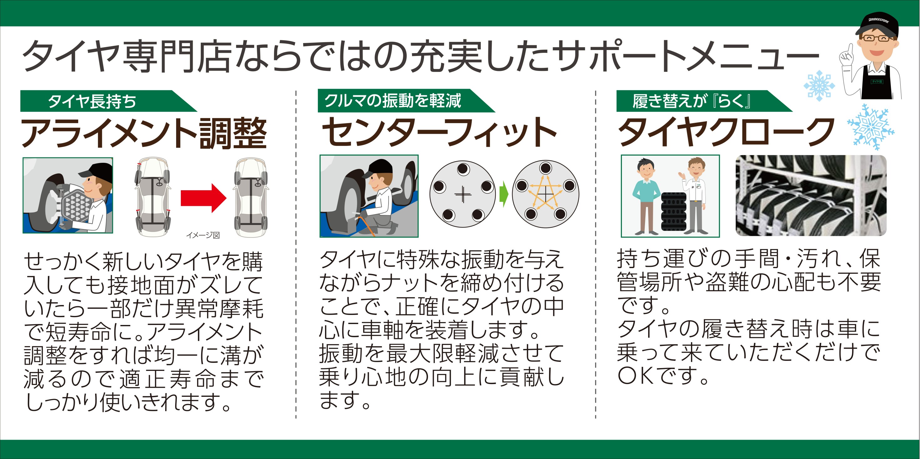 その中でも、『アライメント調整』『センターフィット』『タイヤクローク』を特にお勧めしております!