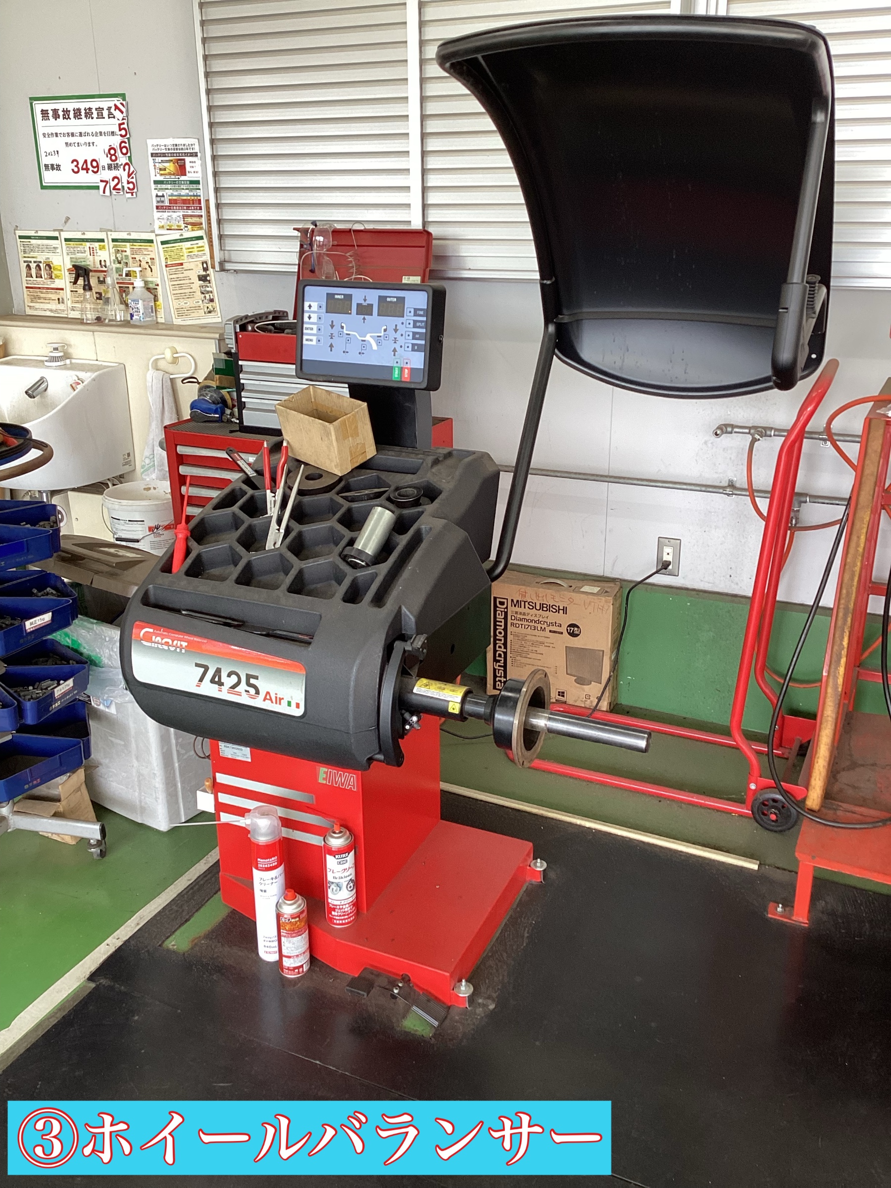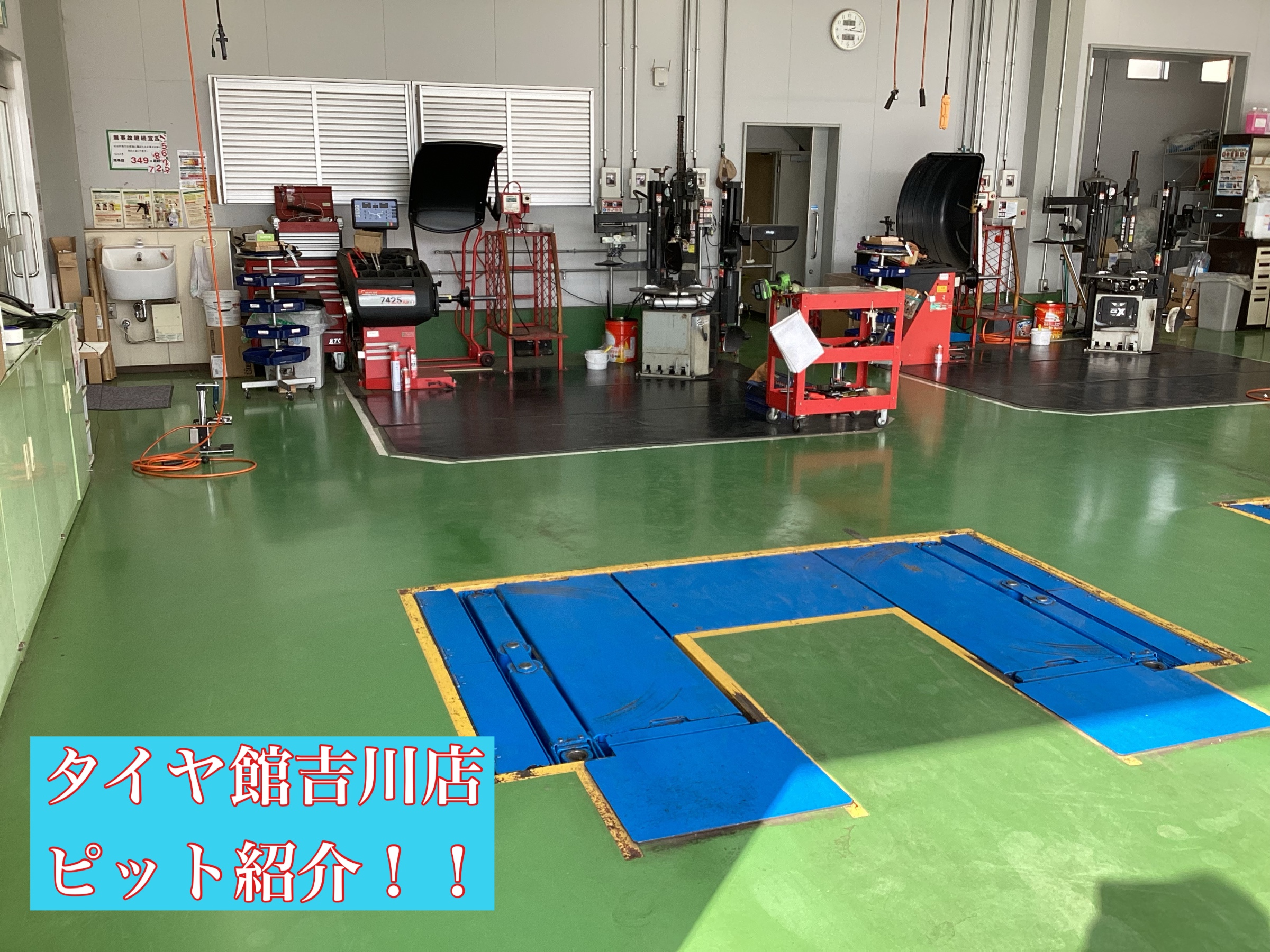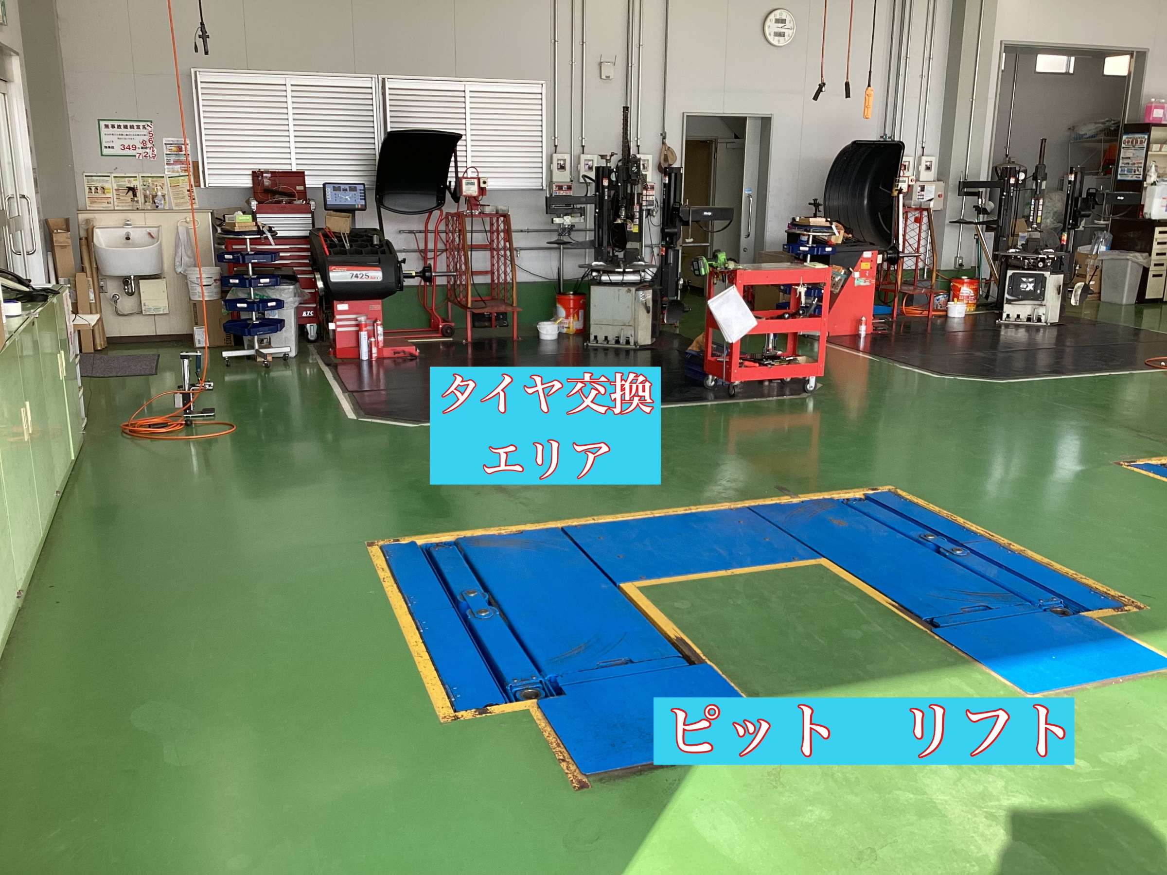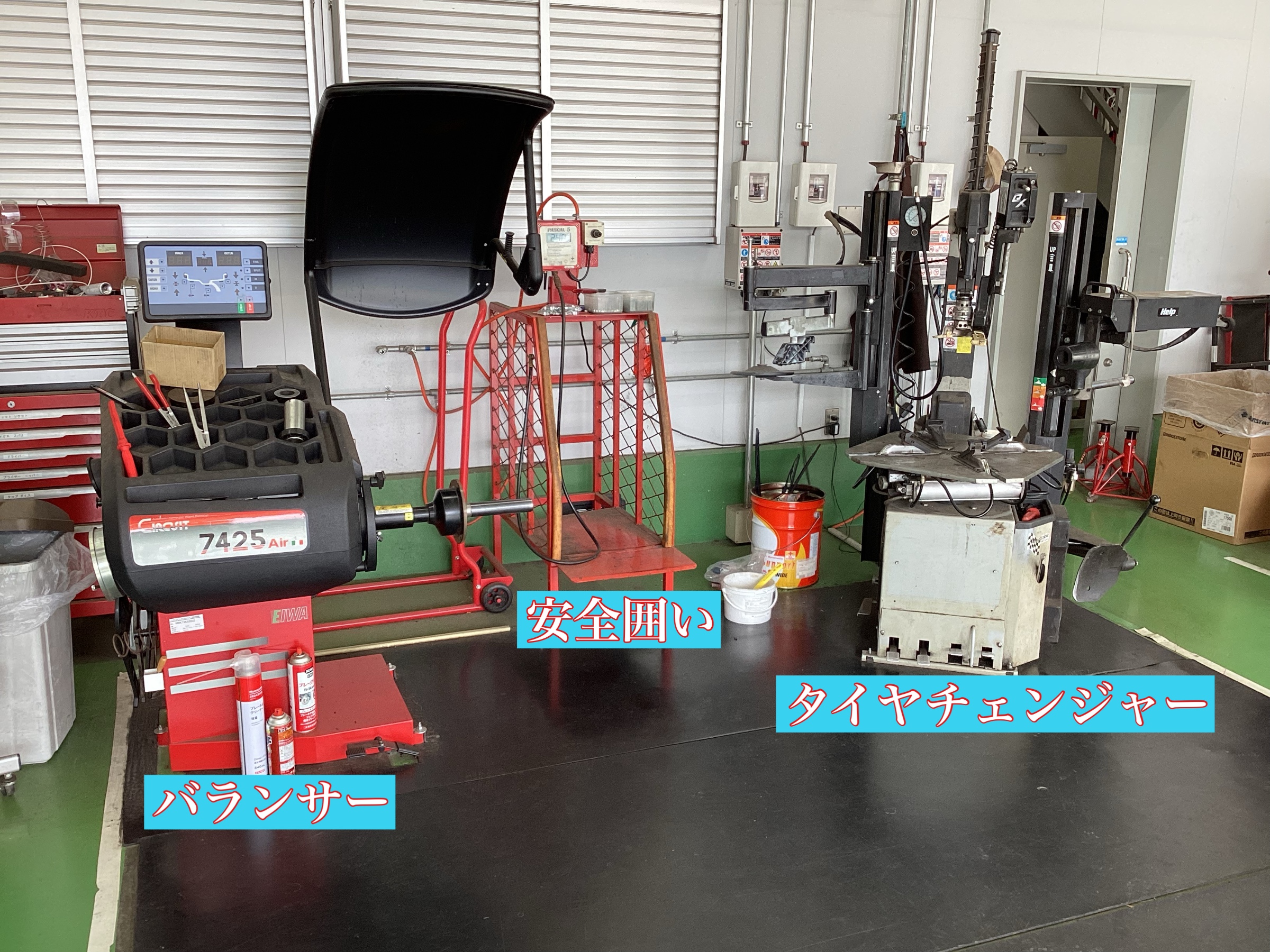そして、奥に機械が並んでいる所が、「タイヤ交換スペース」でございます! 少し近づいて見てみましょう!