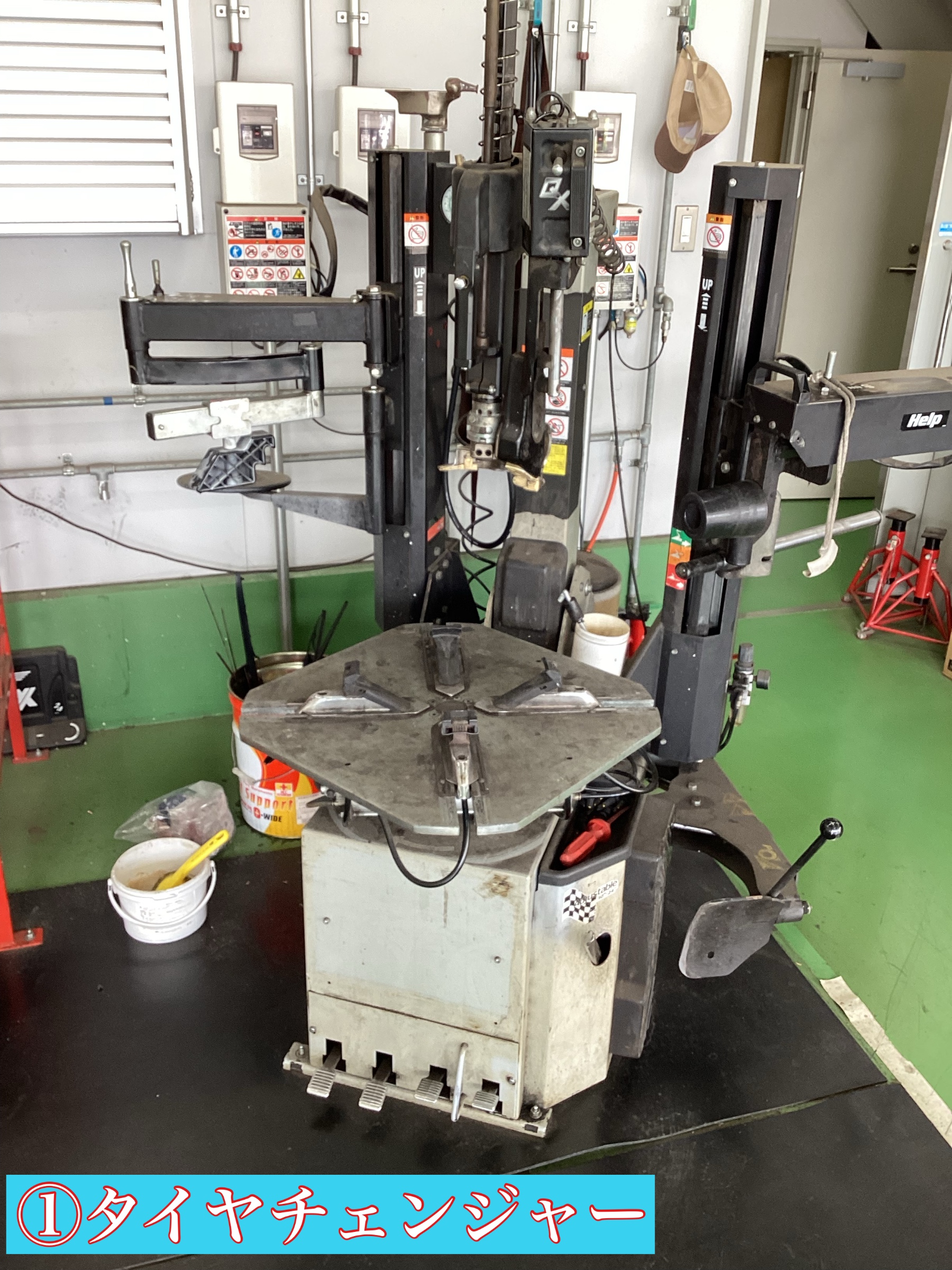 この機械で、タイヤの組み換え作業を行います。 人間の力だけでは、とてもできそうにないのでこの機械でタイヤをバラし、新品タイヤを組付けていきます。