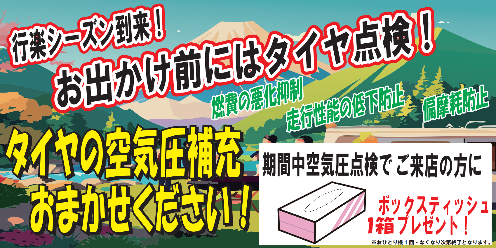 いまなら、タイヤ点検にご来店された方に「ボックスティッシュ」をプレゼント!