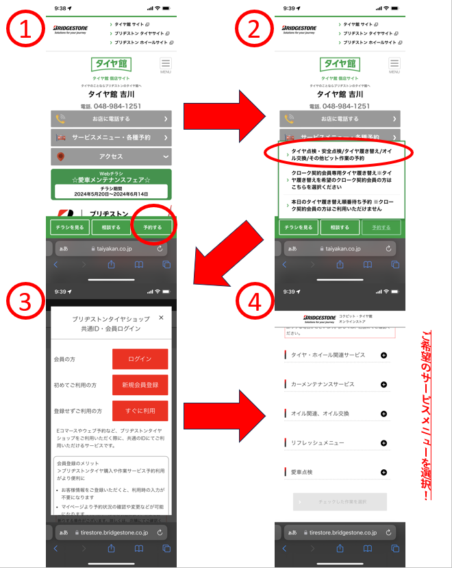 画像では、このような流れで予約が可能です! (クローク会員(お預かりサービス)の予約は、入口が異なるため、予約方法が異なります。)