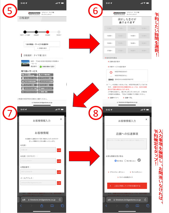 ⑧店舗への伝達事項があれば入力し、内容のお間違いがなければ「予約を確定」をタップ