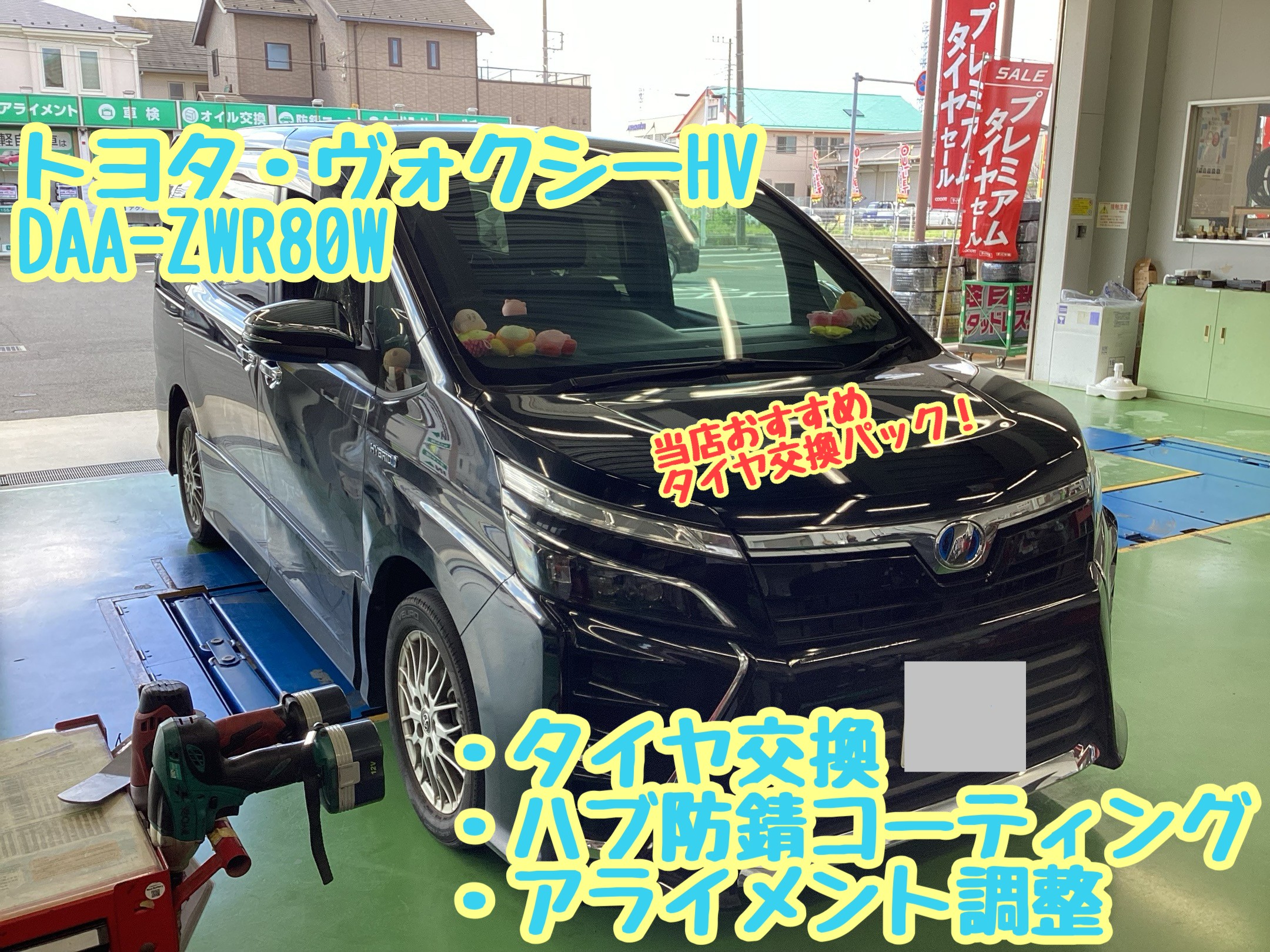 トヨタ・ヴォクシー(DBA-ZWR80W) より、タイヤ交換・ハブ防錆施工・アライメント調整のご紹介です!