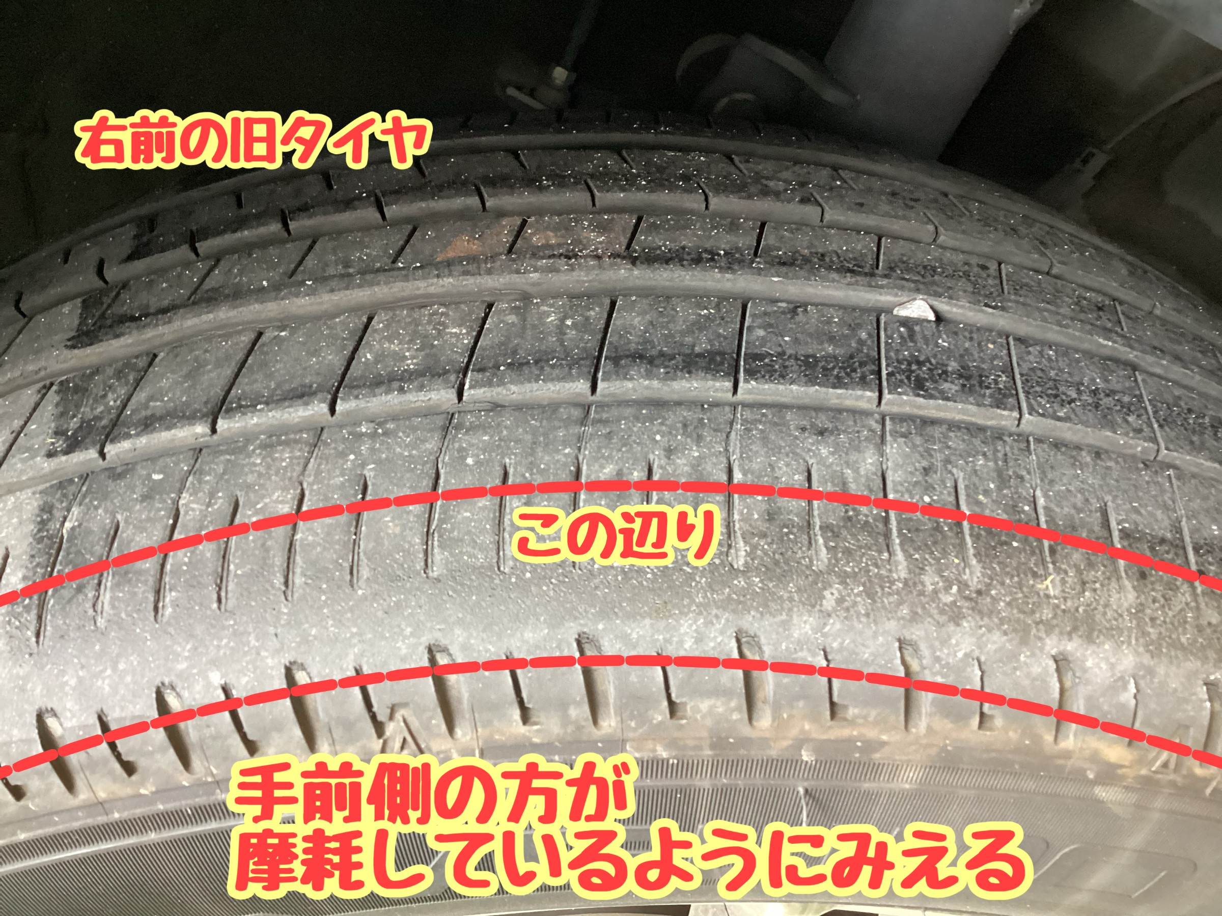 手前側(外側)が偏って摩耗しているように見えます。この減り方が奥側(内側)にもあれば空気圧不足の原因も考えられますが、外側にしか見えなかったので、アライメントのずれが原因とされます。(アライメントだけが原因とは限らず、アライメント調整したからといって摩耗が改善されないこともあります。詳しくは、スタッフまでお気軽にご相談ください。)