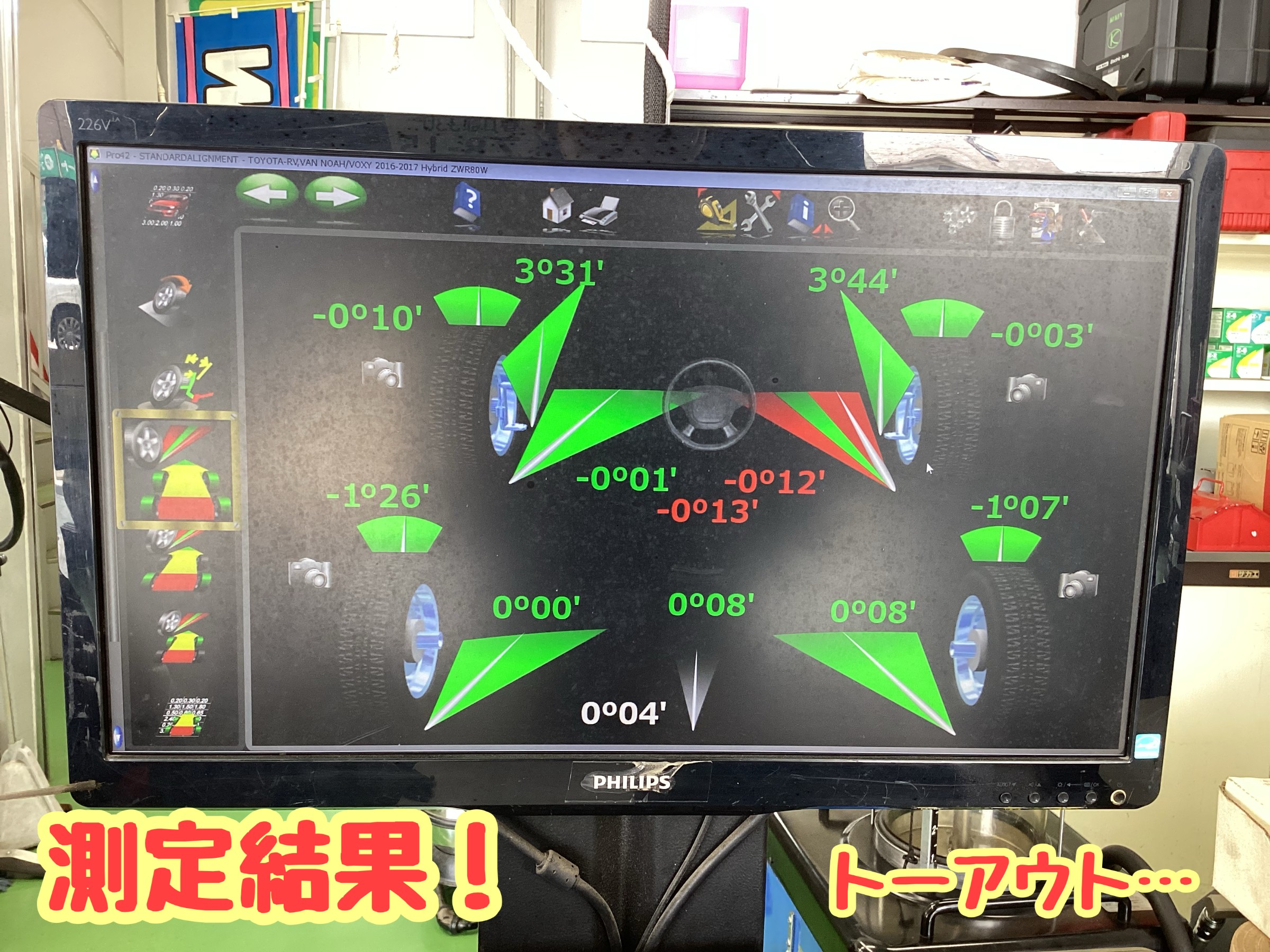 右前がトーアウトになっていますね。 このずれ方は、縁石に乗り上げた等の衝撃が原因かな?