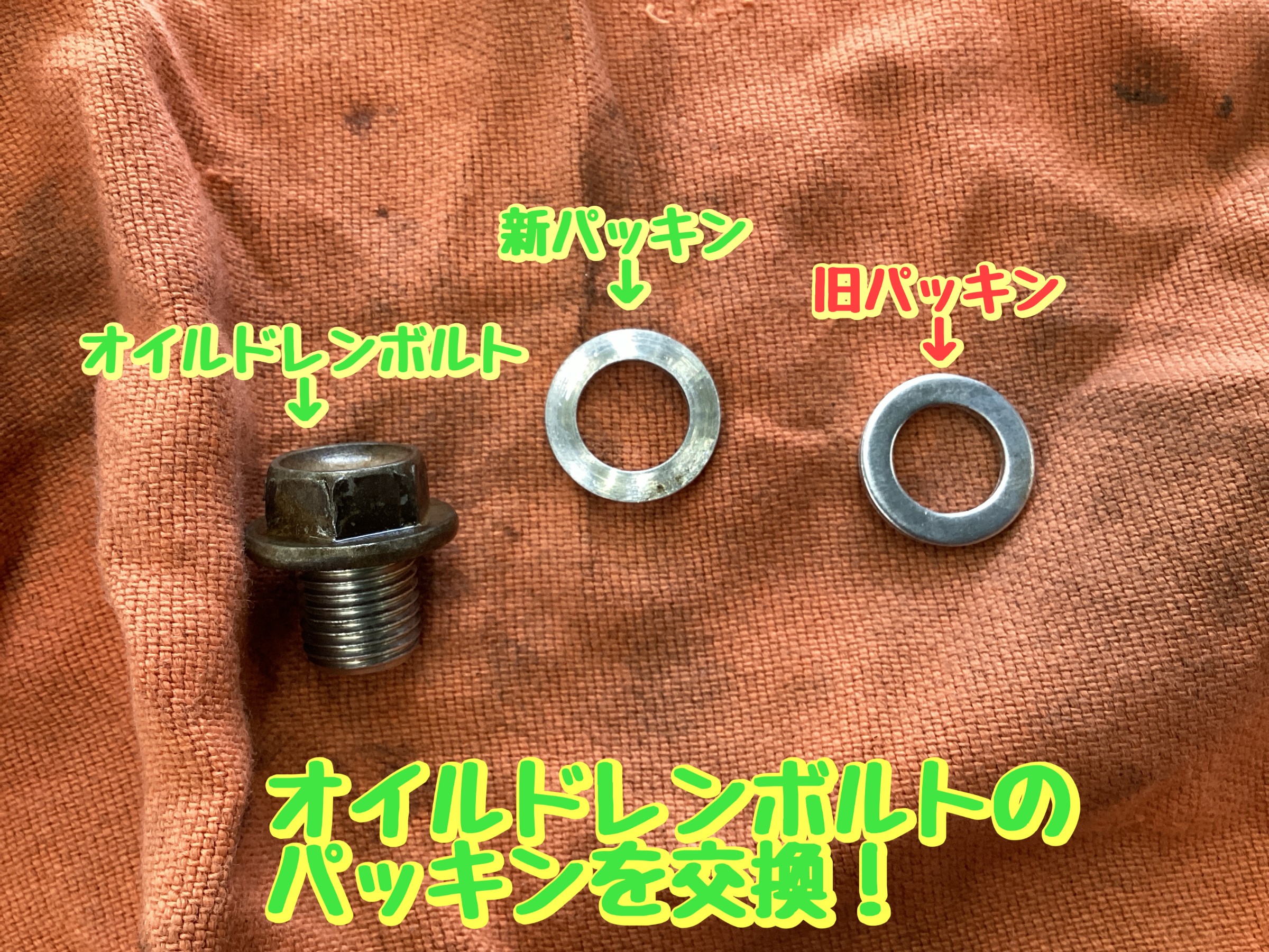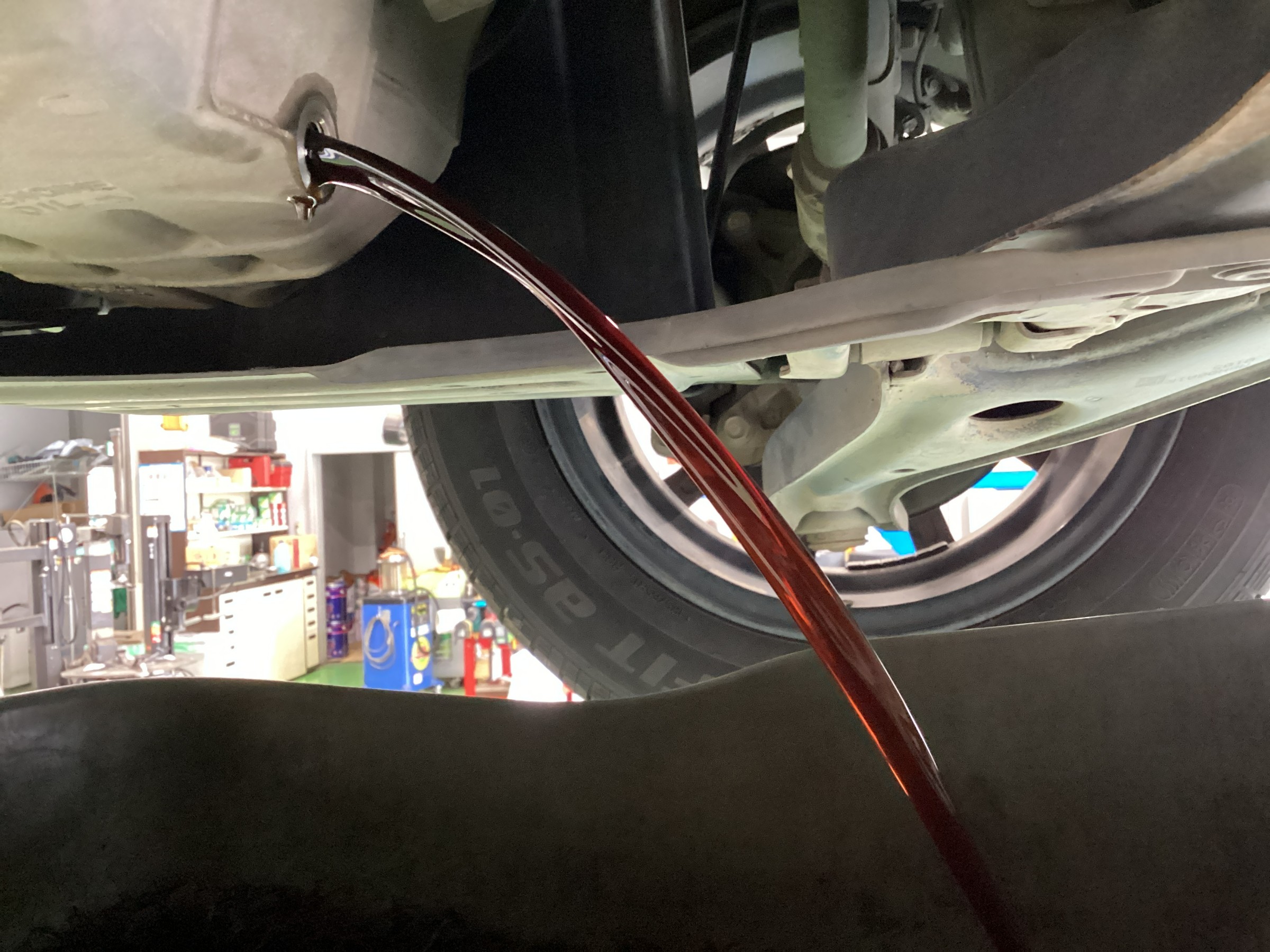 勢いよくオイルが出てきます! この間に、ドレンボルトにある「パッキン」を交換します。