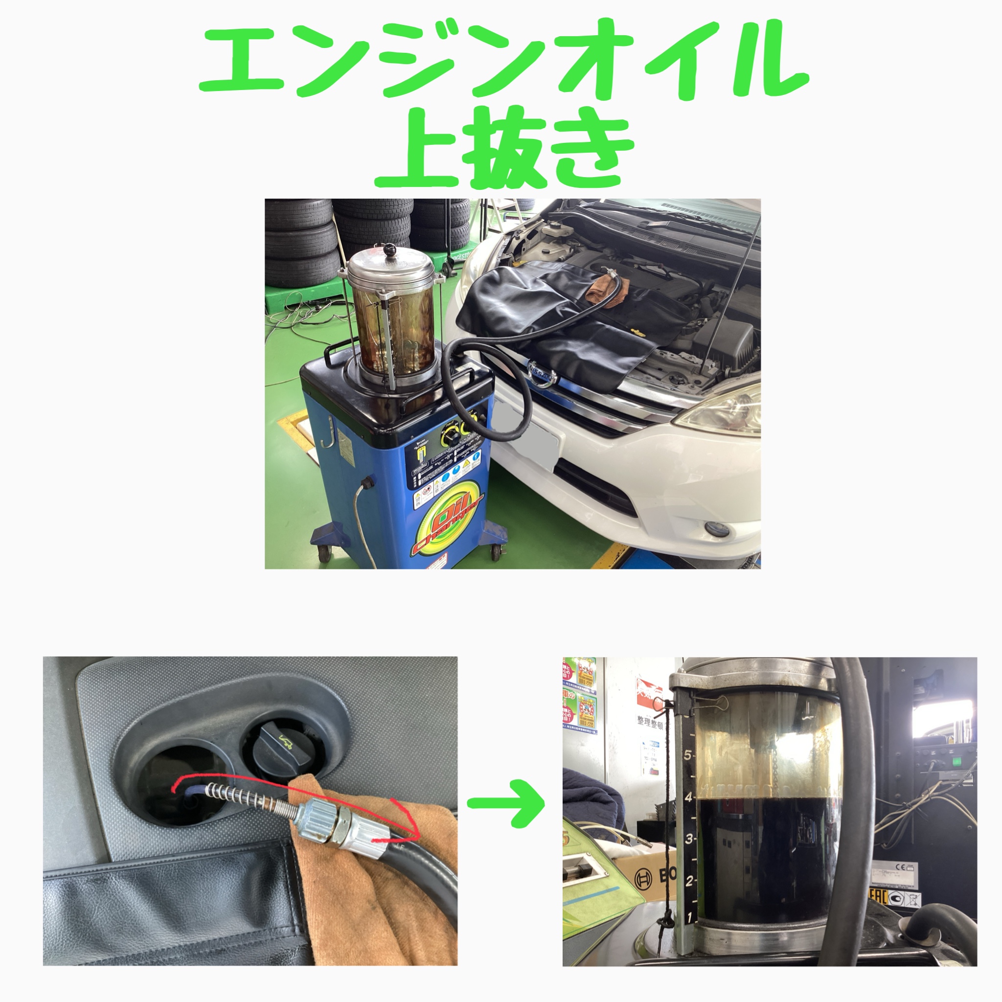 反対に「上抜き」もありますが、これはレベルゲージがあるところに吸入ホースを挿入し抜く作業です。