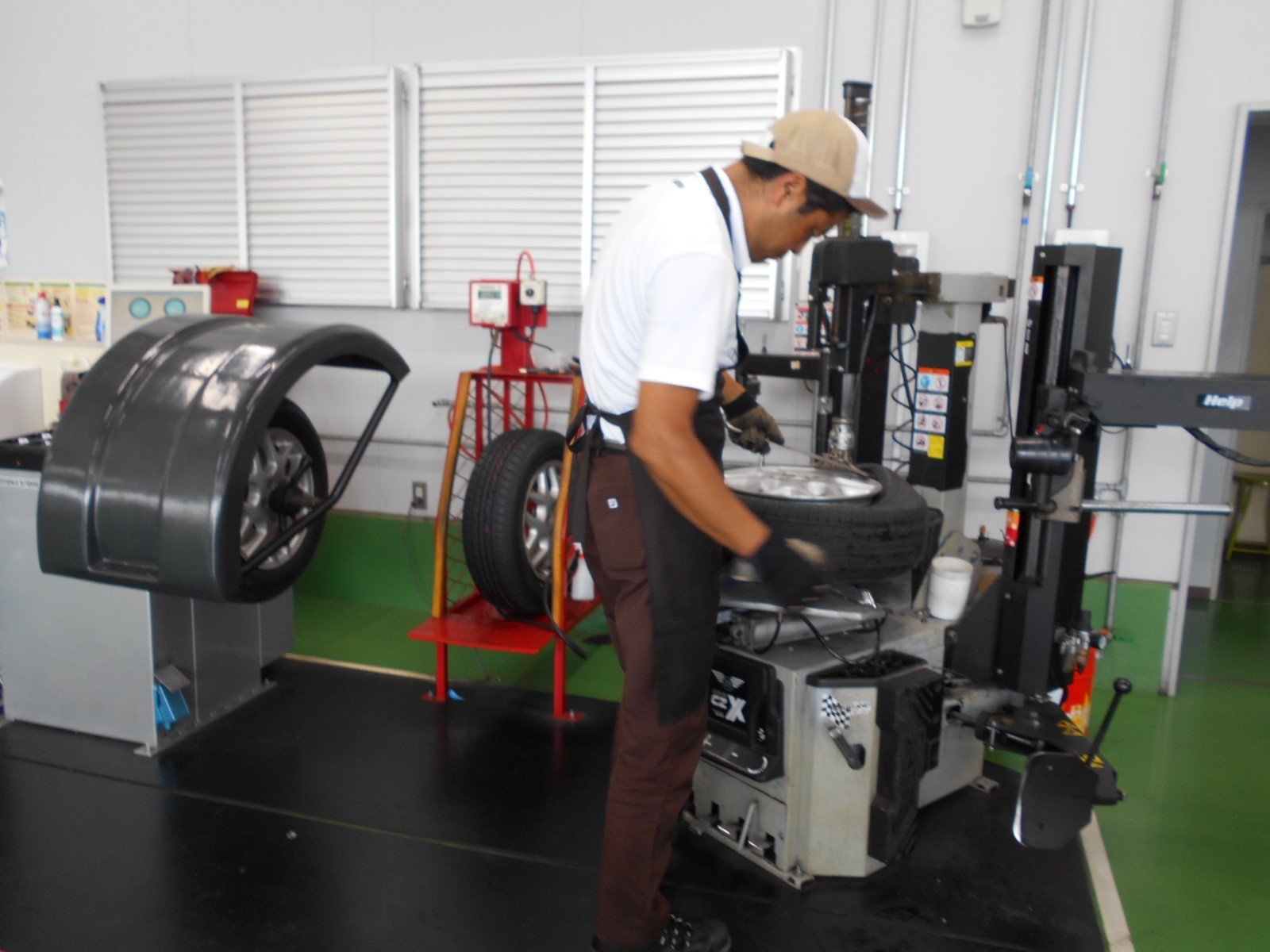 ①古いタイヤをバラシ、新品タイヤを組み付ける。