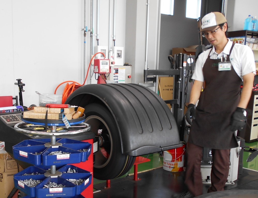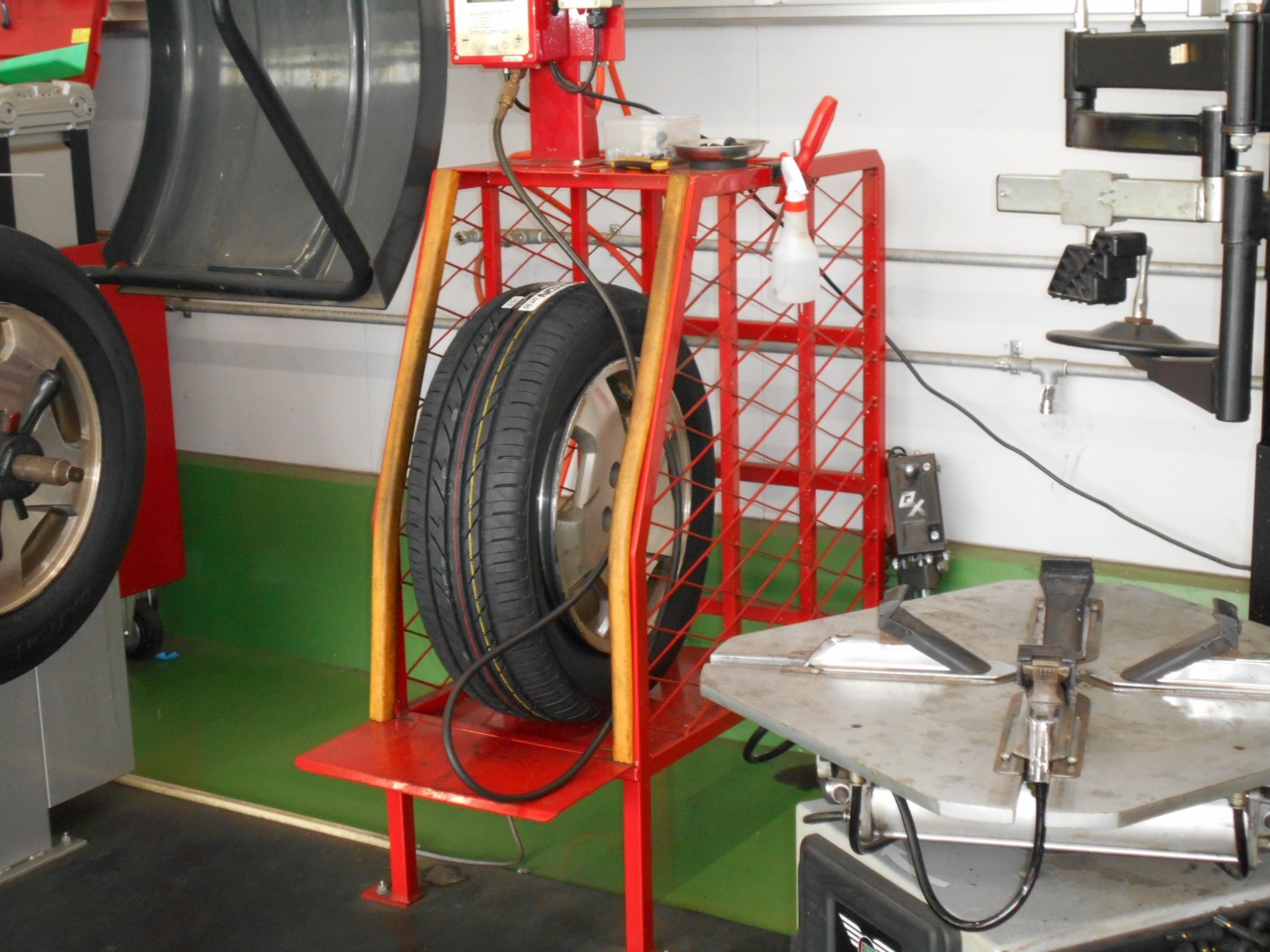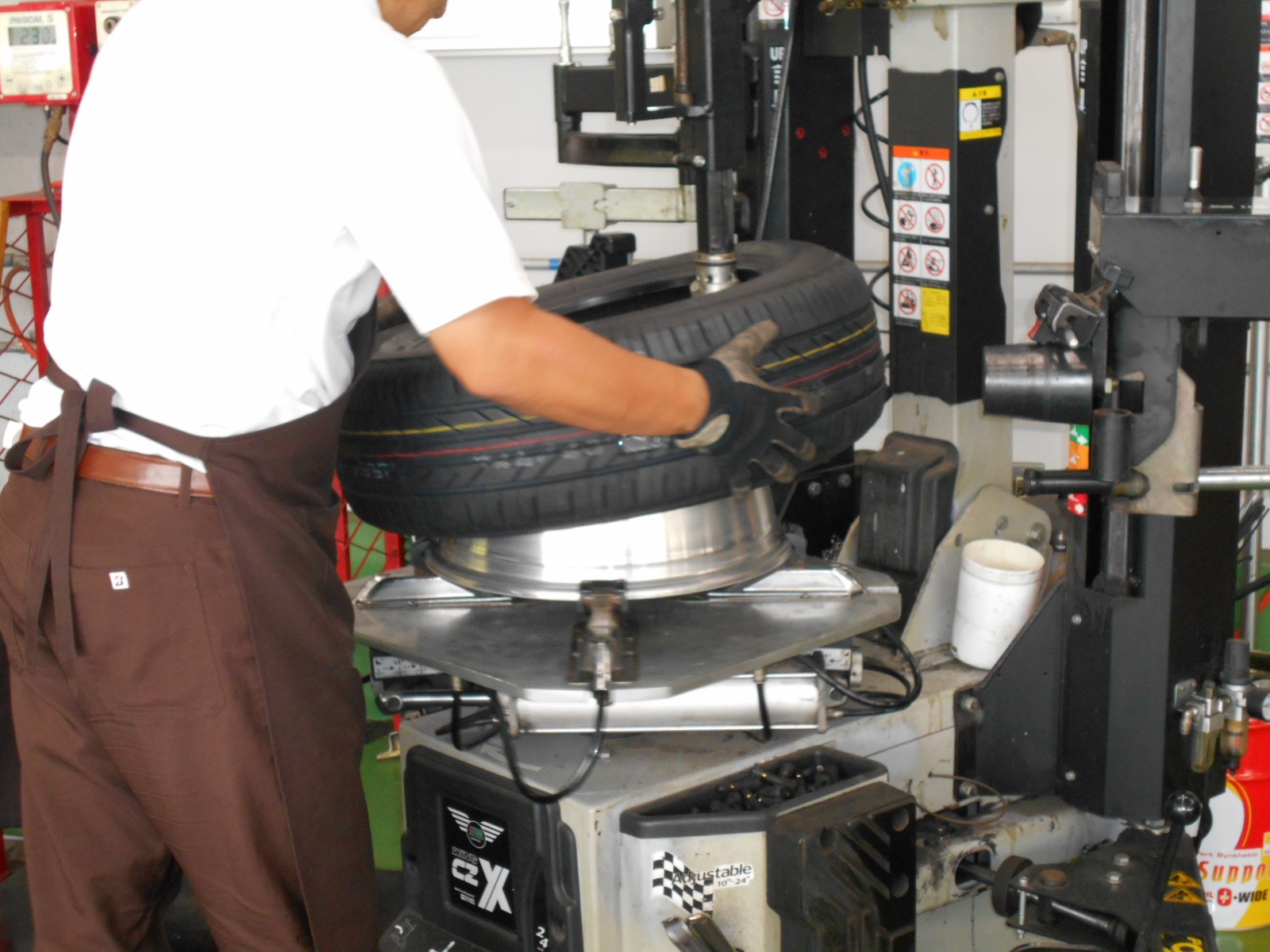 ①古いタイヤをバラシ、新品タイヤを組み付ける。