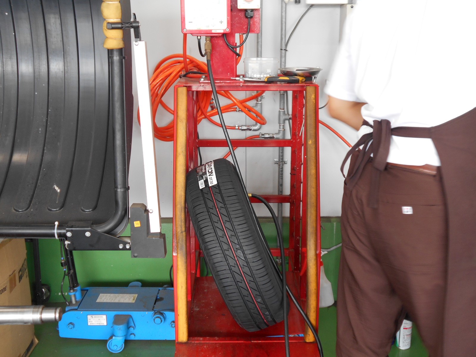 ③赤い囲いの中に、組付けたタイヤを入れセットしたら空気圧充填!
