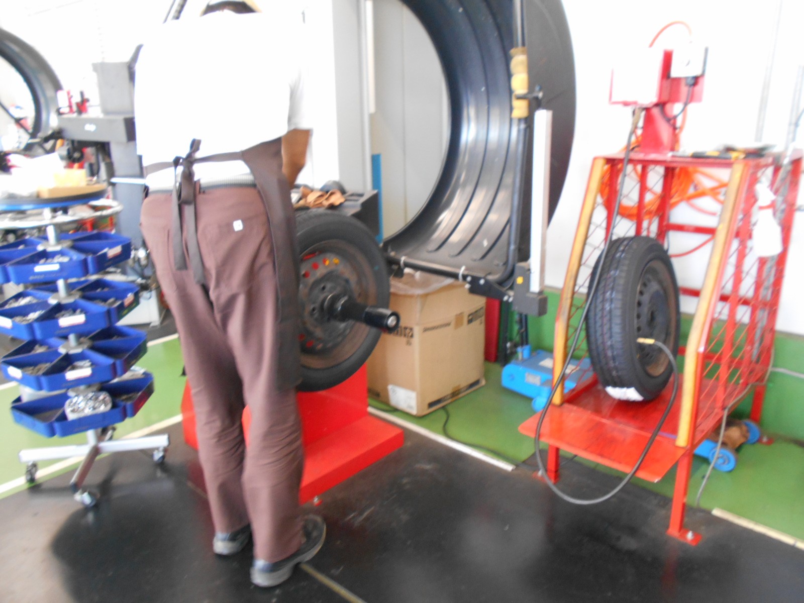 ①新品タイヤを組み込み、赤い安全囲いに入れて空気圧充填中~