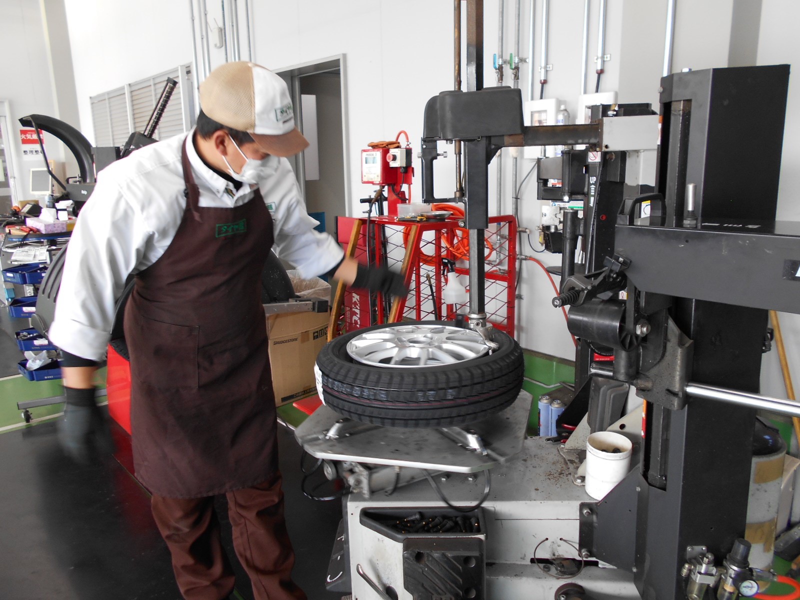 ①新品ホイールに、新品タイヤを組み付けます。