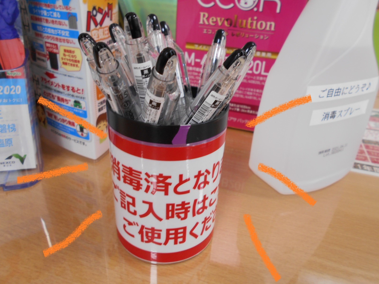 ①消毒済みのボールペンをご用意しております。
