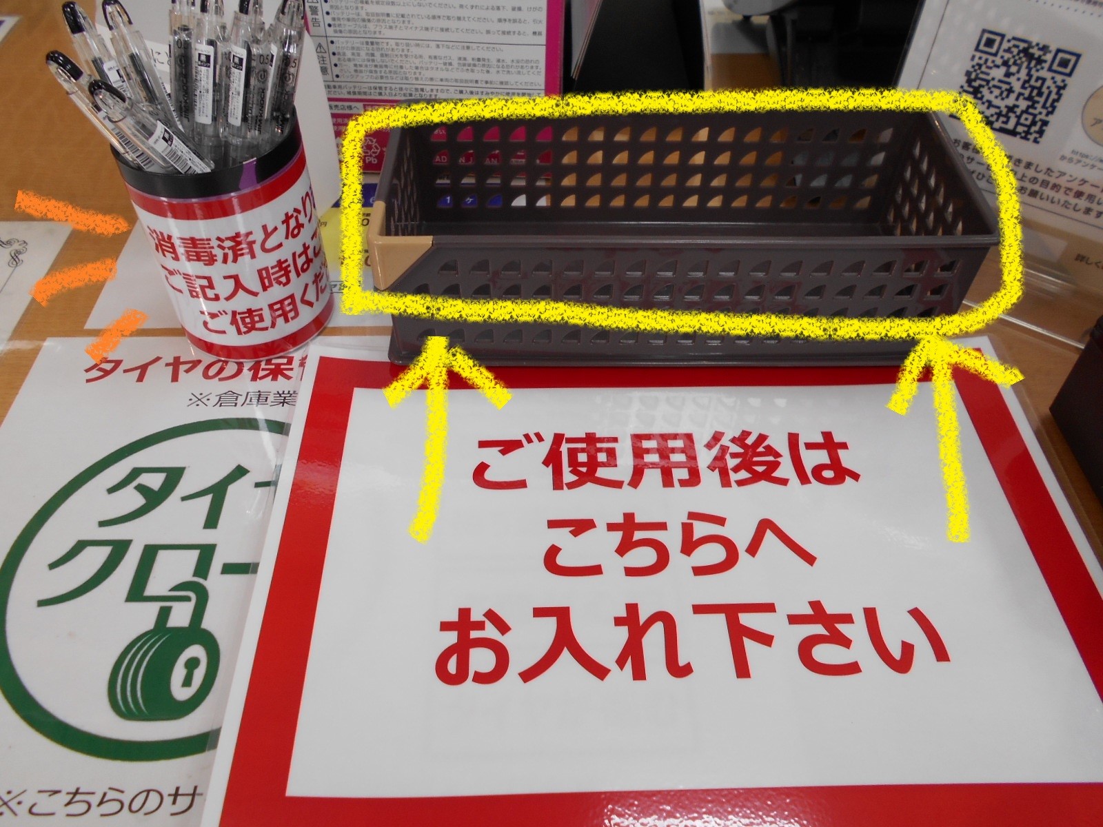 ②また、ご使用後のボールペンは茶色のカゴにお入れください。
