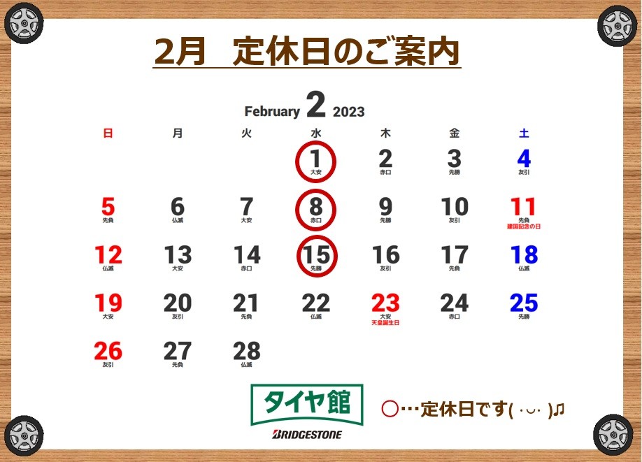 15日は定休日となります。 ポスト 2023年2月14日 タイヤ館四街道ホームページをご覧いただき、ありがとうございます♪ 15日(水)は、定休日となります。 ご利用のお客様にはご不便をお掛けすることとなりますが、 何卒ご理解、ご了承の程、よろしくお願い申し上げます。 本日は通常通り、元気に営業中!! 営業時間は、【10:30~19:00】 タイヤ新品交換やタイヤ空気圧点検、 オイル交換やバッテリー・ワイパー交換などなど、 皆さまのご来店をスタッフ一同心よりお待ちしております