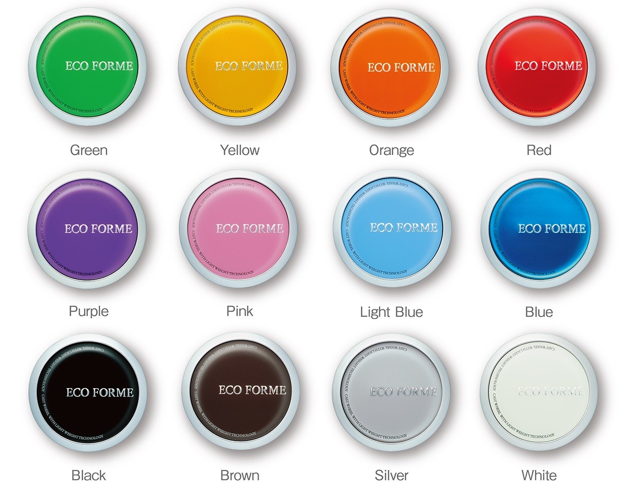 ECO FORMEのオプションカラーキャップは全12色。グリーン、イエロー、オレンジ、レッド、パープル、ピンク、ライトブルー、ブルー、ブラック、ブラウン、シルバー、ホワイトの中から、ボディカラーはもちろんお好みに合わせて自由にお選びいただけます。