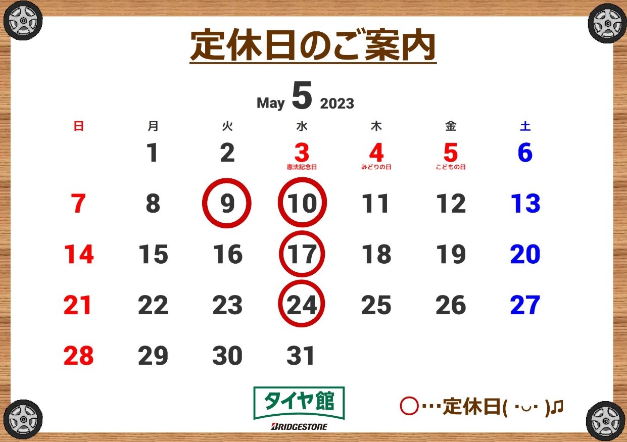 9日、10日は定休日になります。 ポスト 2023年5月8日 タイヤ館四街道のホームページをご覧いただき、ありがとうございます♪ 9日(火曜日)10日(水曜日)は、定休日となります。 ご利用のお客様にはご不便をお掛けすることとなりますが、 何卒ご理解、ご了承の程、よろしくお願い申し上げます。 また、定休日でも作業予約が可能!! 便利なWEB予約もご利用くださいませ。 タイヤ館 四街道 住所:284-0044千葉県四街道市和良比313-1 電話番号: 043-433-3711