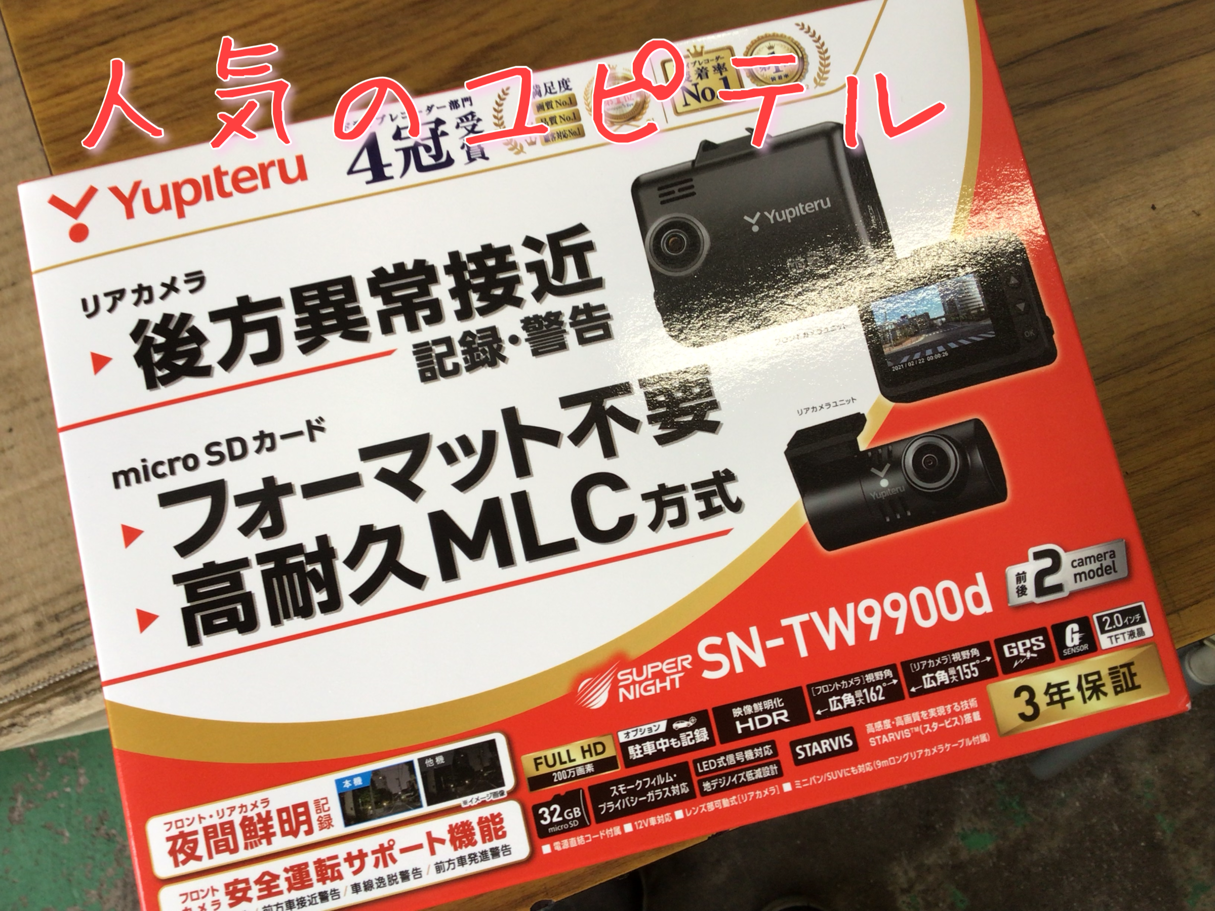 お取り付けさせていただく商品は、ユピテルの前後撮影式ドライブレコーダー!