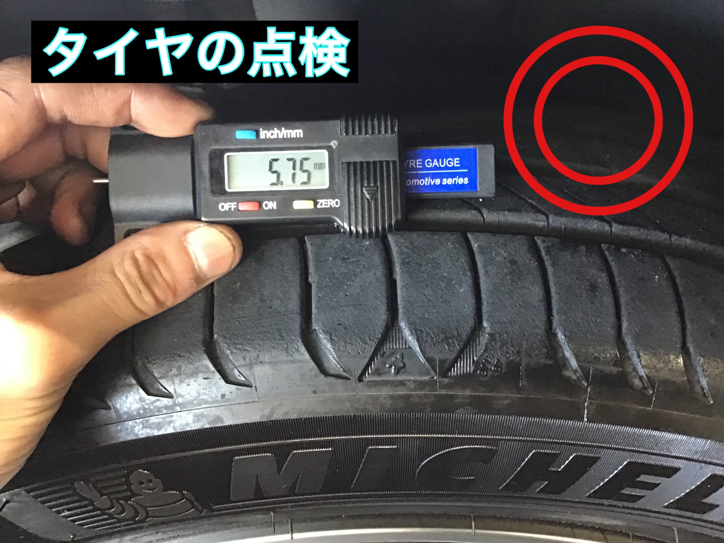 タイヤの残溝は5.7mm。使用継続可能です!