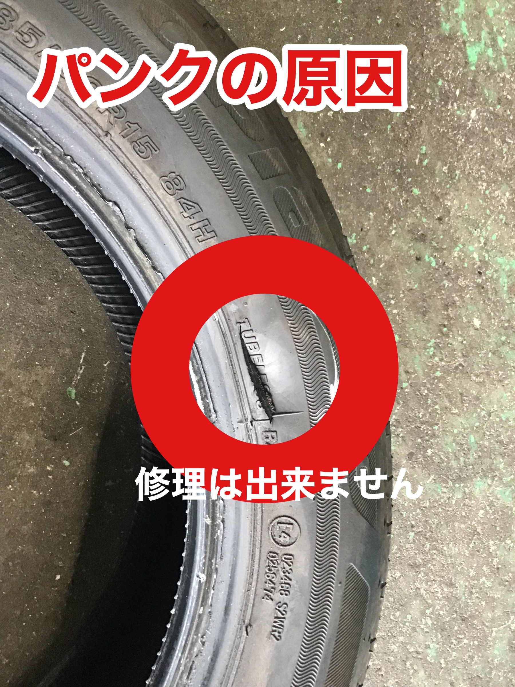 サイドウォール部が完全に切れてしまっています。