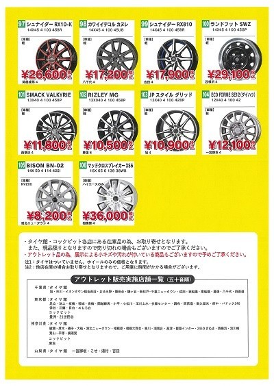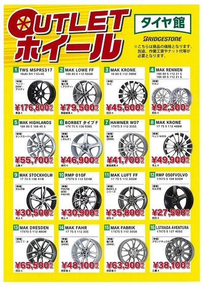 アウトレットアルミホイールSALE ポスト 2024年6月1日 長期展示品のアウトレットホイール一掃セール開催中! タイヤ交換を考えている方はこの機会にいかがですか? 大変お買い得な掘り出しものもあるかもしれません!! 各メーカー品が特別価格にて購入できるアウトレットホイールフェア実施中!全て、現品限りの1点物となりますので、お早めに! ※タイヤ館各店の展示品となる為、多少の色褪せや、細かな傷等ある場合がございます お取り寄せになる場合がございますので、あらかじめお知らせいたします。 詳しくはスタッフまでお尋ねください。 カテゴリ:お知らせ