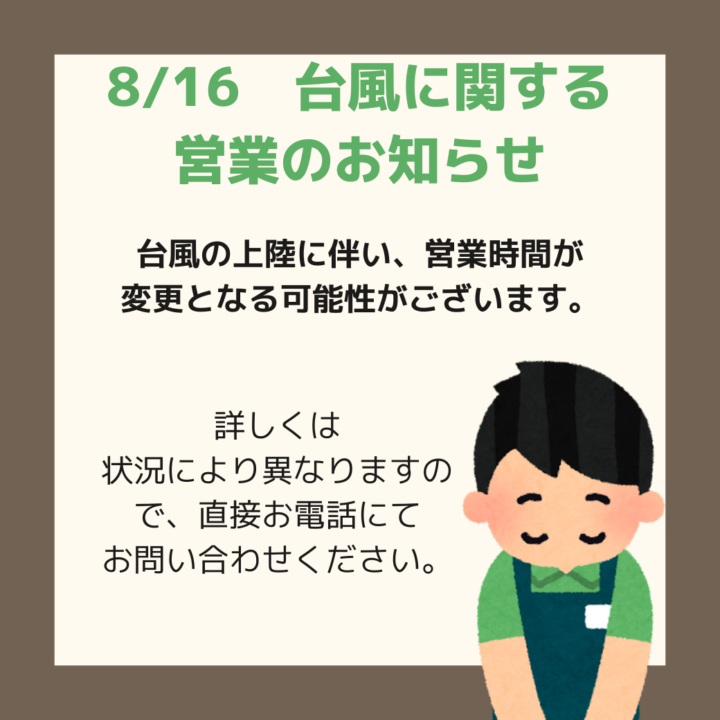 台風に伴う営業時間のお知らせ ポスト 2024年8月15日 いつもホームページをご覧いただき誠にありがとうございます。 この度、台風の接近、上陸に伴い お客様の安全と、作業の安全、従業員の安全を 確保する為、営業時間が短縮となる可能性がございます。 大変ご不便をおかけしますが、ご了承ください。 詳しくは、台風状況によって変わりますので 直接店舗にお問い合わせください。 タイヤ館 四街道 住所:284-0044千葉県四街道市和良比313-1 電話番号: 043-433-3711 相談予約 タイヤ点検・安全点検/タイヤ履き替え/オイル交換/その他ピット作業の予約
