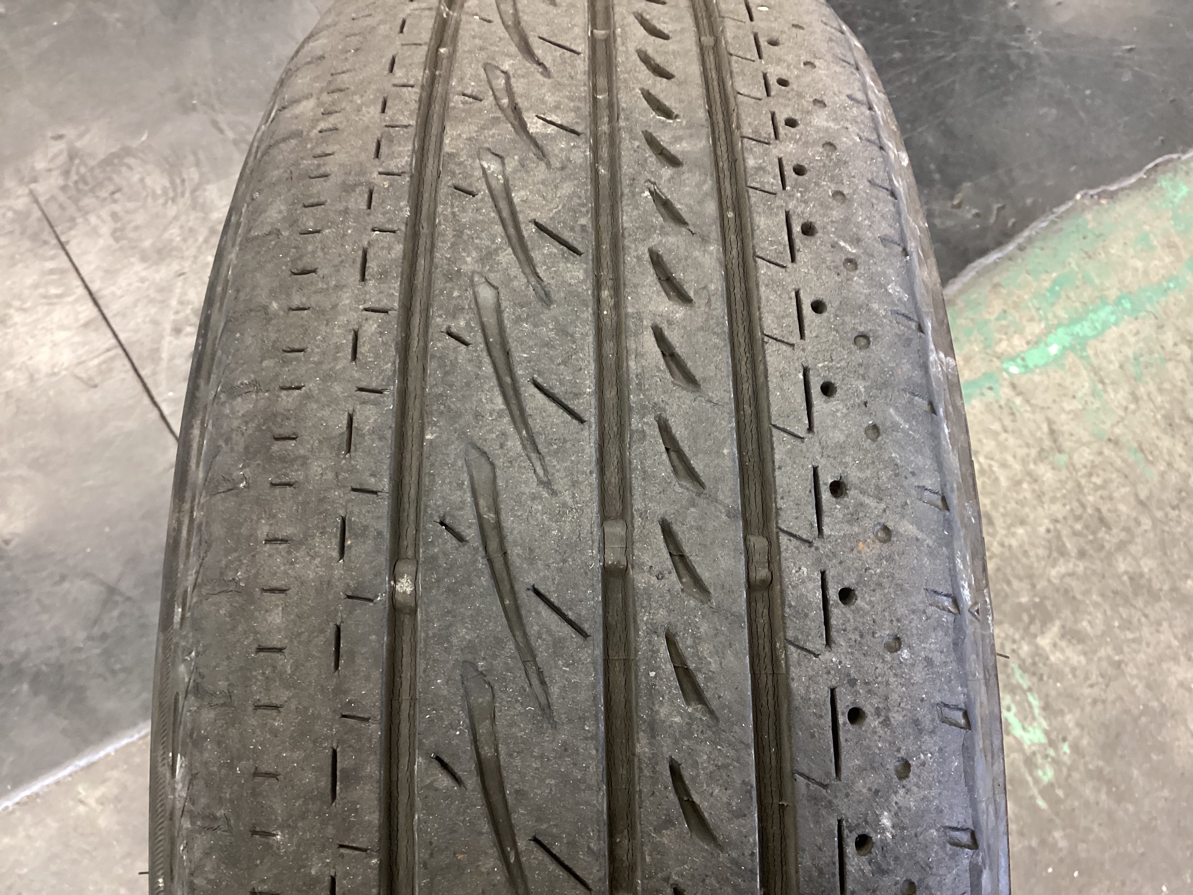 摩耗による溝の減少や若干の偏摩耗が発生しており、タイヤ交換の時期的にはちょうど良い頃合いですね。