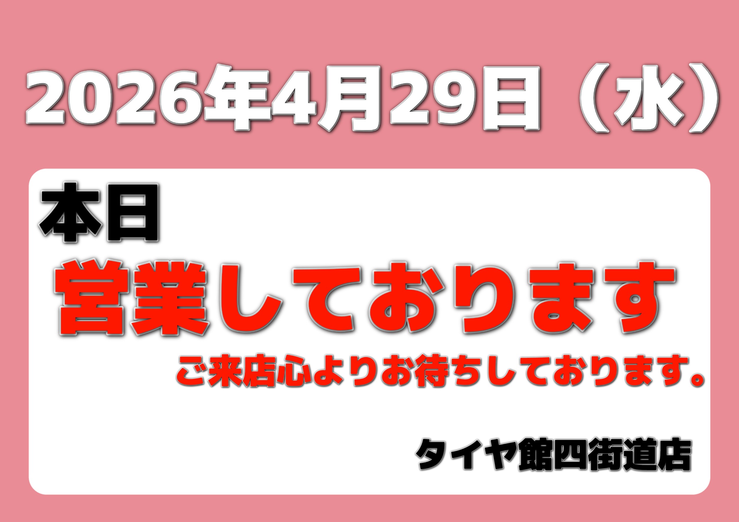 4月29日(水)本日、営業しております!! ポスト 2026年4月29日 いつもタイヤ館四街道店のホームページをご覧いただきありがとうございます。 通常、水曜日は定休日でお休みを頂いておりますが 2026年4月29日(水)本日、営業しております! ※祝日の為、混雑が予想されます。 予めご了承ください。 ご来店心よりお待ちしております。 タイヤ館 四街道 住所:284-0044千葉県四街道市和良比313-1 電話番号: 043-433-3711 相談予約 担当:千葉 実里