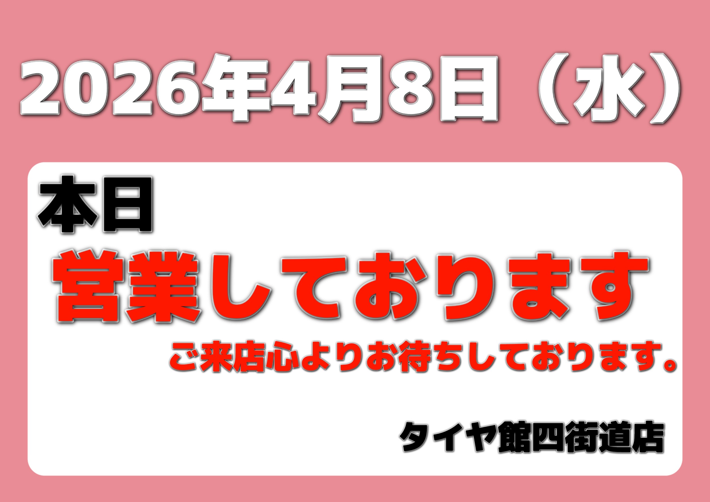 記事一覧 4月8日(水)本日、営業しております!!【タイヤの日!!】 いつもタイヤ館四街道店のホームページをご覧いただきありがとうございます。 通常、水曜日は定休日でお休みを頂いておりますが 2026年4月8日(水)本日、営業しております! ご来店心よりお待ちしております。 本日はタイヤの日!! 2026年4月8日 ポスト
