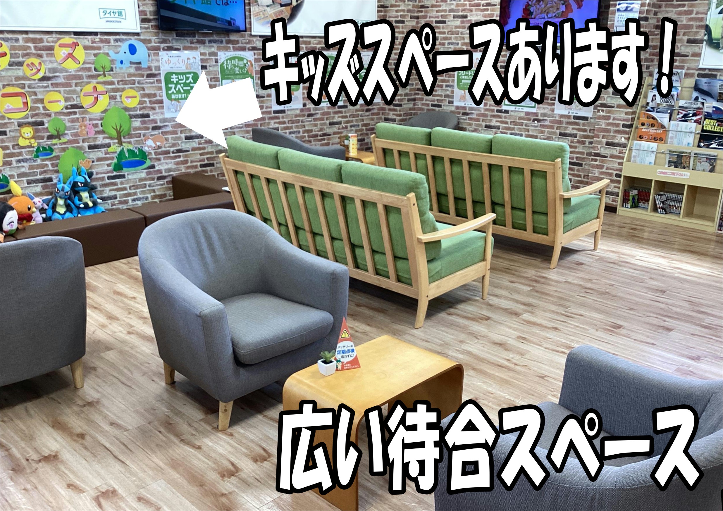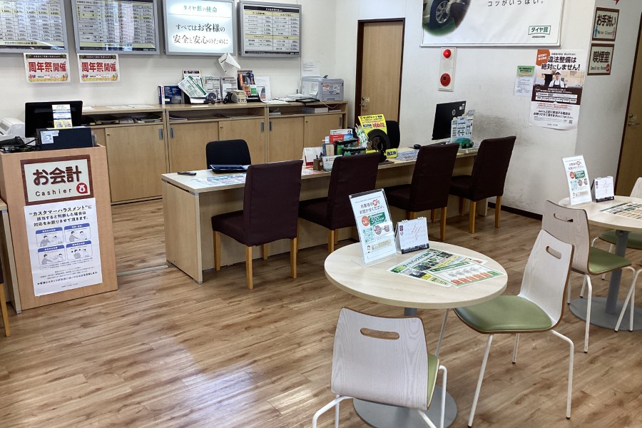 また、タイヤだけではなくオイル交換やバッテリーなど、お車のメンテナンスも承っておりますし待っている間のフリードリンクやキッズスペースも完備しております。