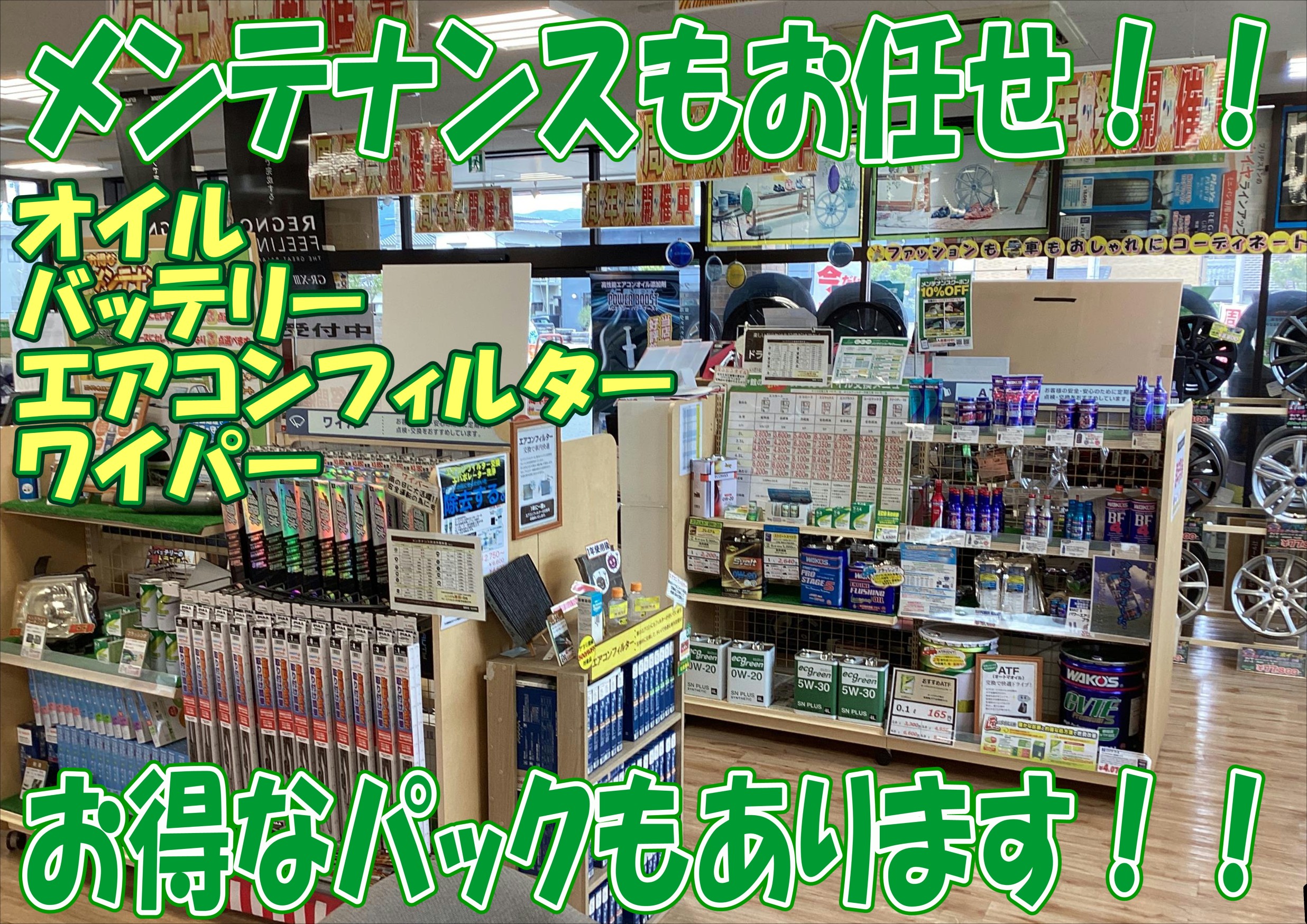 当店ではバッテリー、オイル、ワイパーなどのメンテナンス用品の販売、交換も可能です。