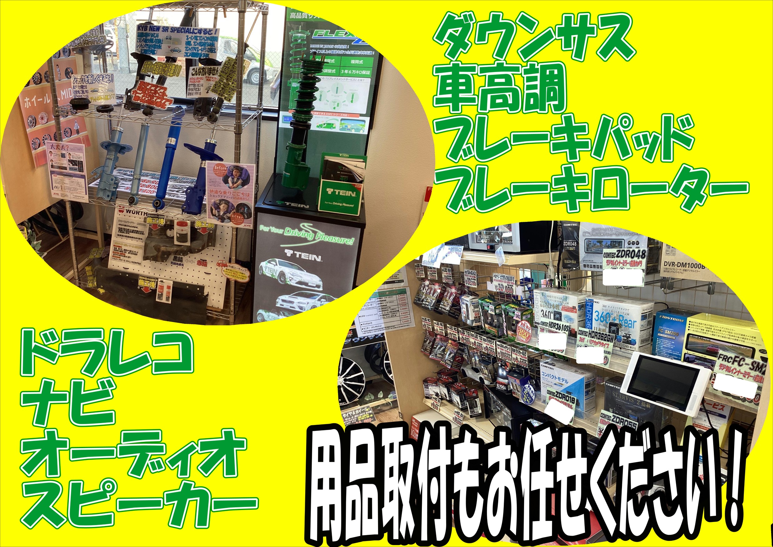 ドラレコ、ナビ、ETCの電装品、車高調、マフラー、社外シートのGTパーツの販売、取り付けも可能!!