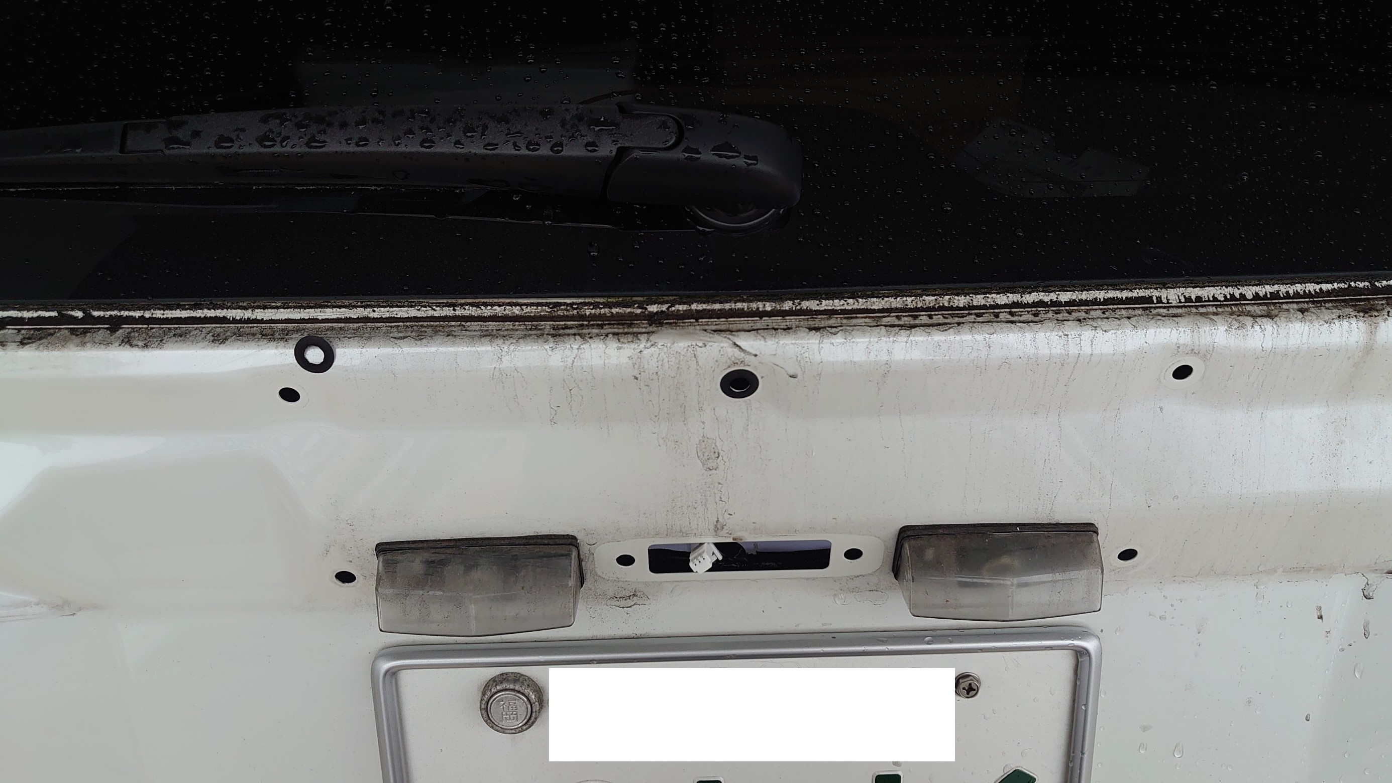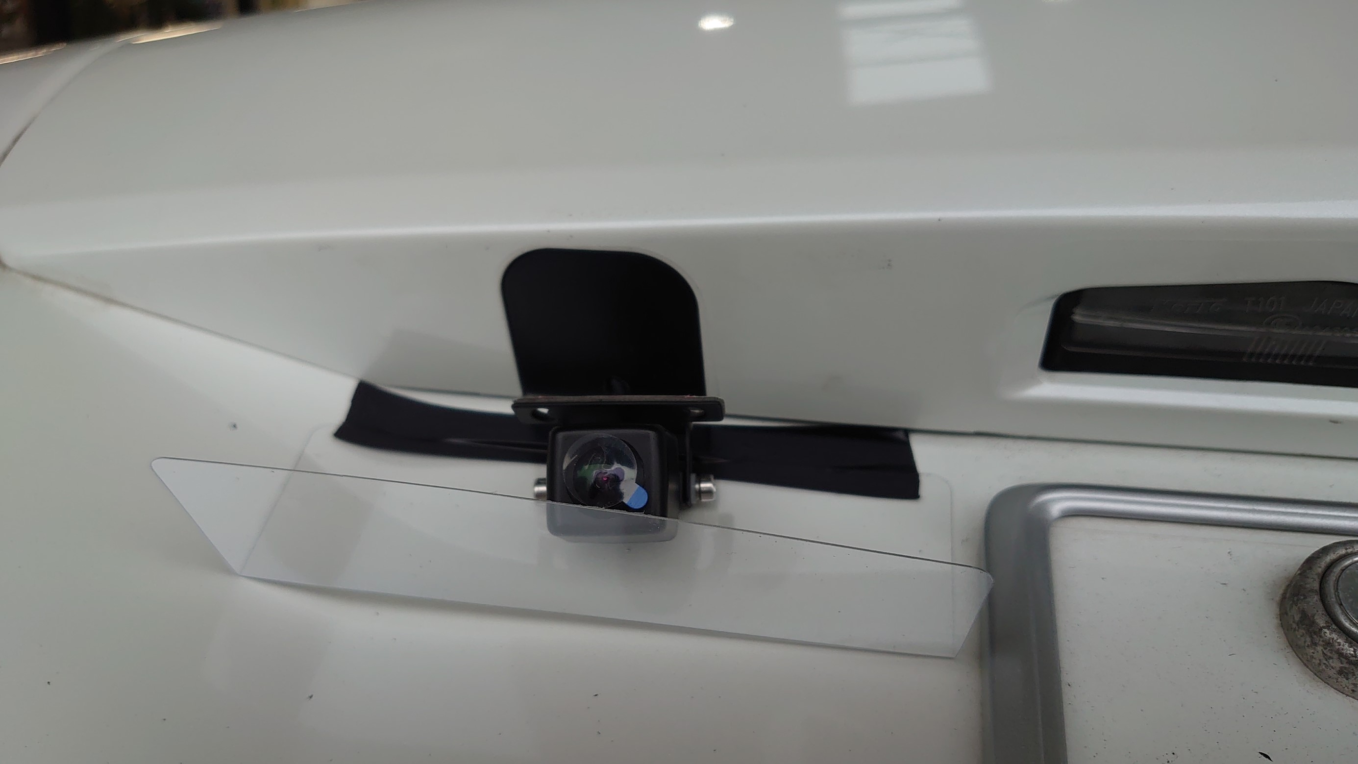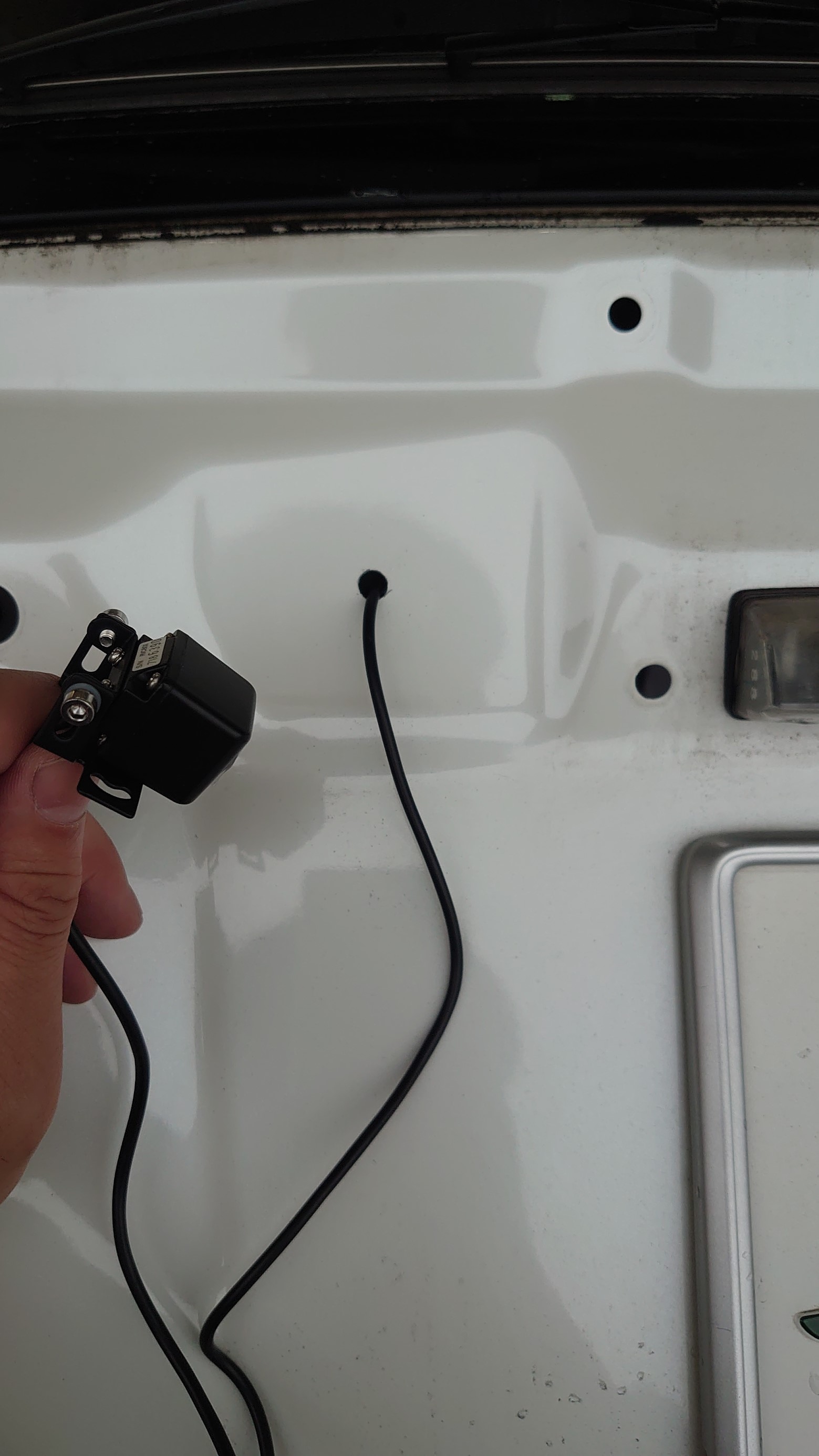 ナンバーの左上に穴を開けてカメラの配線を引き込みます。