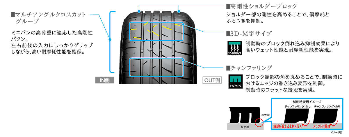 Playz PX-RVⅡは、サイド部の骨組みを強化することで高い剛性を確保し、高荷重なミニバンに適応した重構造でふらつきを抑制する「PX-RVⅡ専用サイド補強」を搭載。また、ショルダー部の剛性を高めることで偏摩耗とふらつきを抑える高剛性ショルダーブロックなどにより高いライフ性能を実現する「ミニバン専用高剛性パタン」を採用しています。