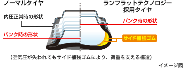 ランフラットタイヤ取り扱っております! S001RFT ポスト BRIDGESTONE POTENZA S001 RFT(ランフラット タイヤ) RFT(ランフラットテクノロジー) 空気圧がゼロになっても、所定のスピードで一定距離を走行可能とする技術 ※ 実車試験又は、ISO 基準に基づいた室内試験条件で、空気圧0kPa 時に「80km/h で80km」まで走行が可能。 カテゴリ:商品情報 タイヤ関連