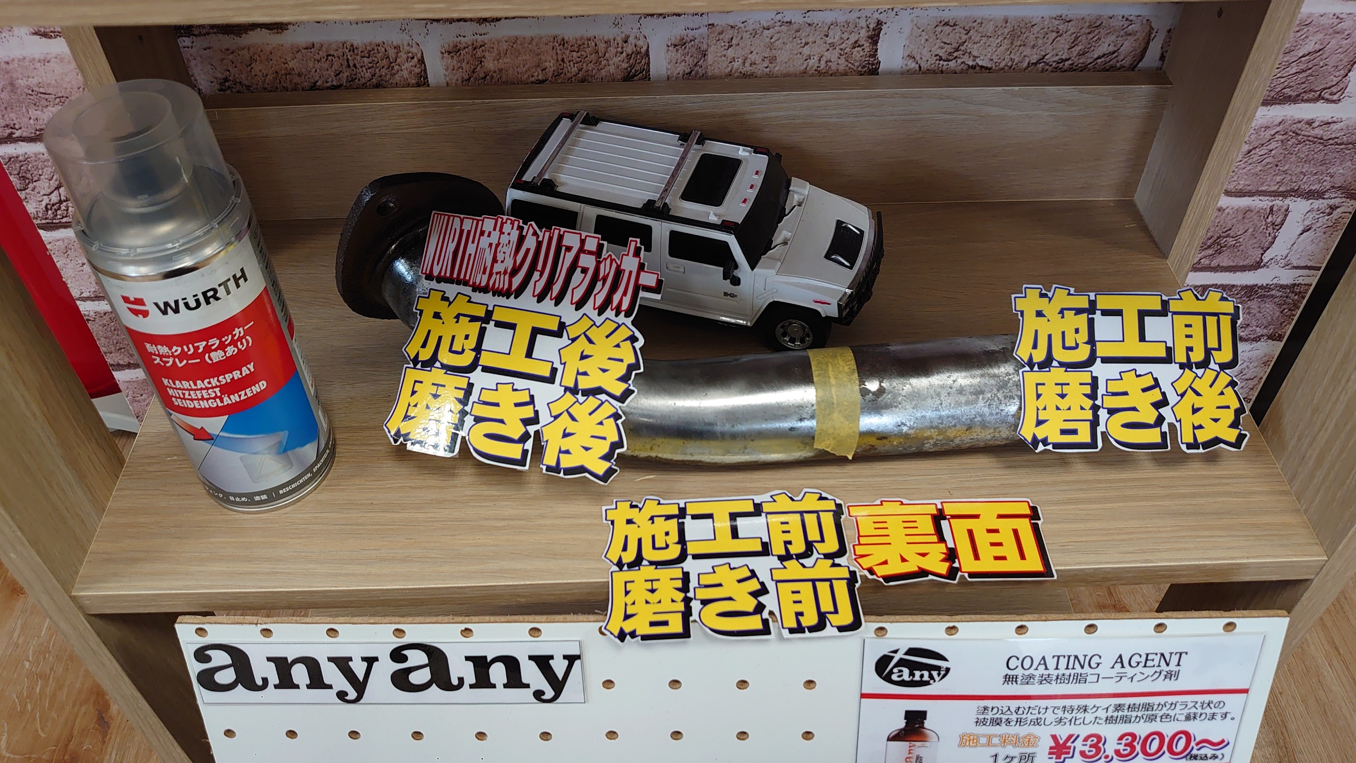 下の段にはマフラー用耐熱防錆剤、WURTH耐熱クリアラッカーの施工前、施工後も見ていただけます!