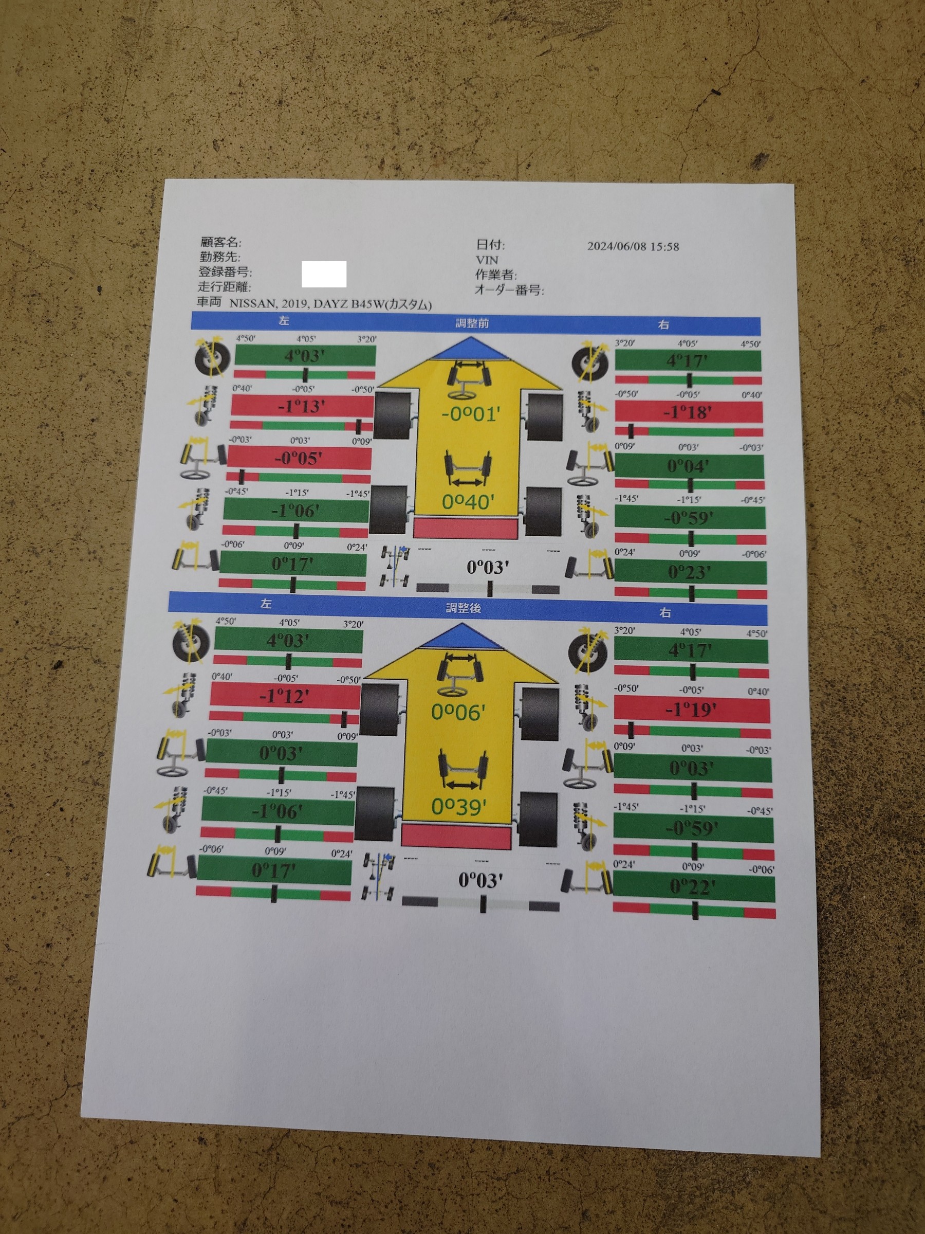 アライメントは前回に車高調を取付いただいたので慣らしが終ってのアライメントになります。