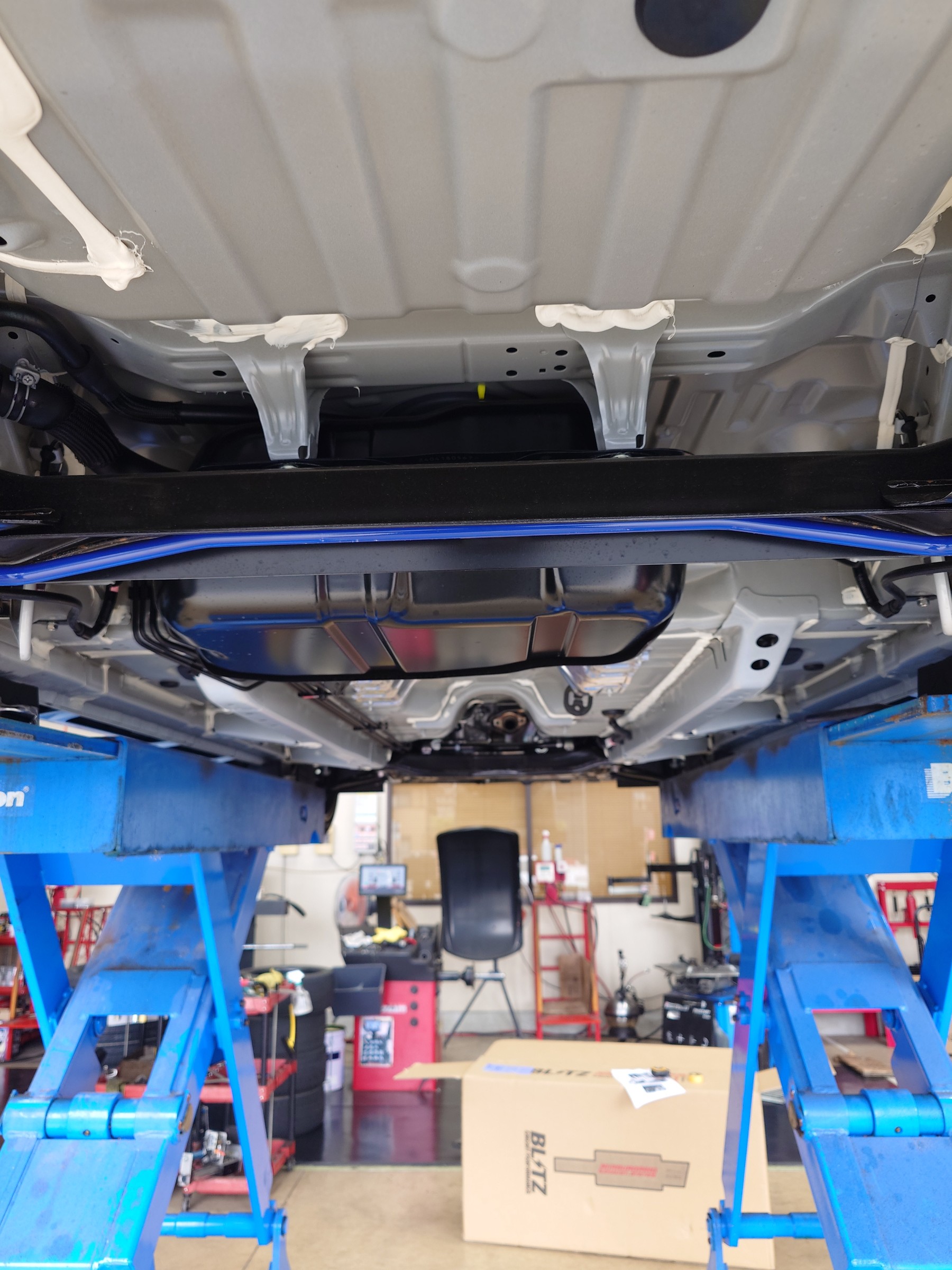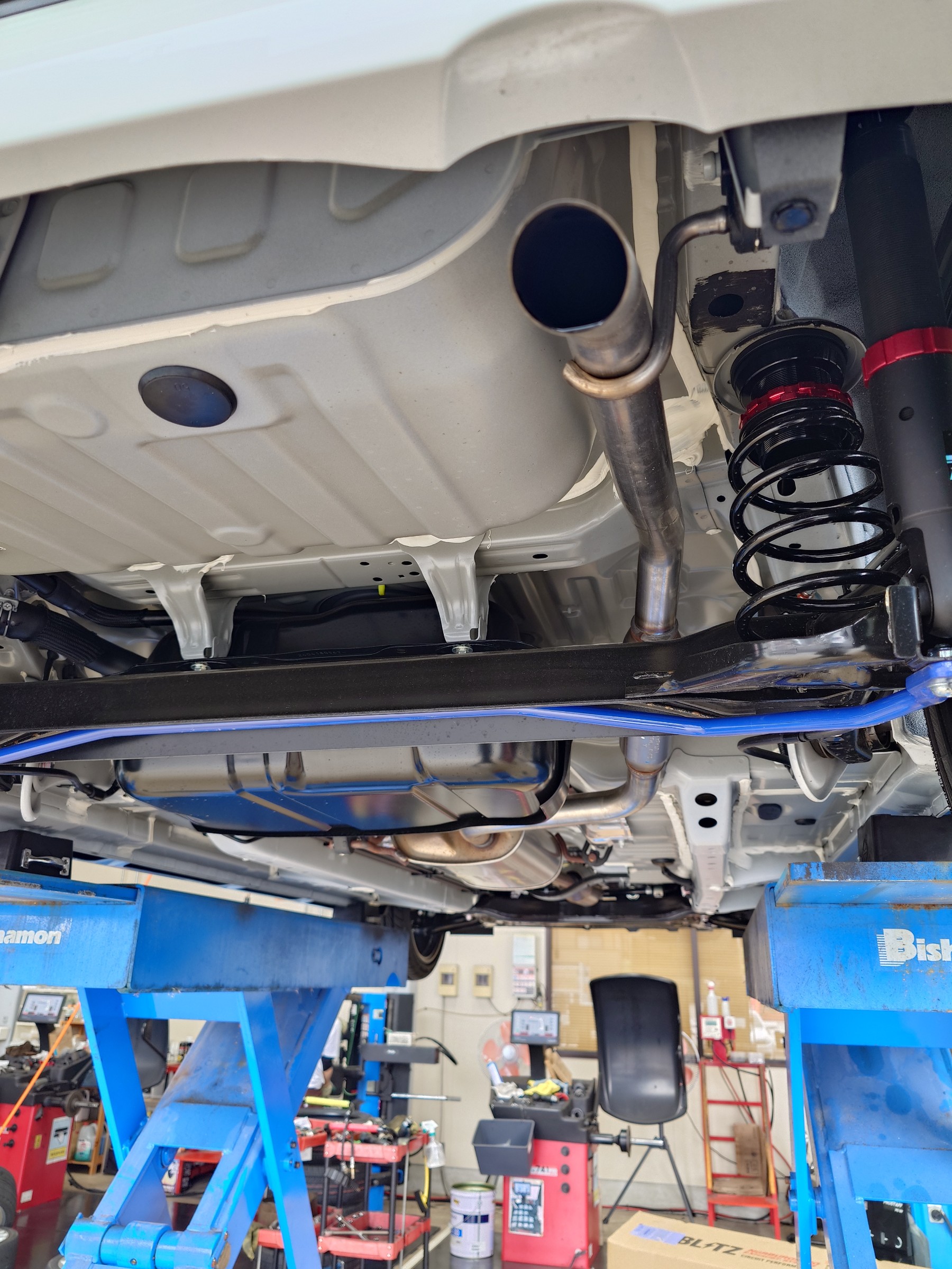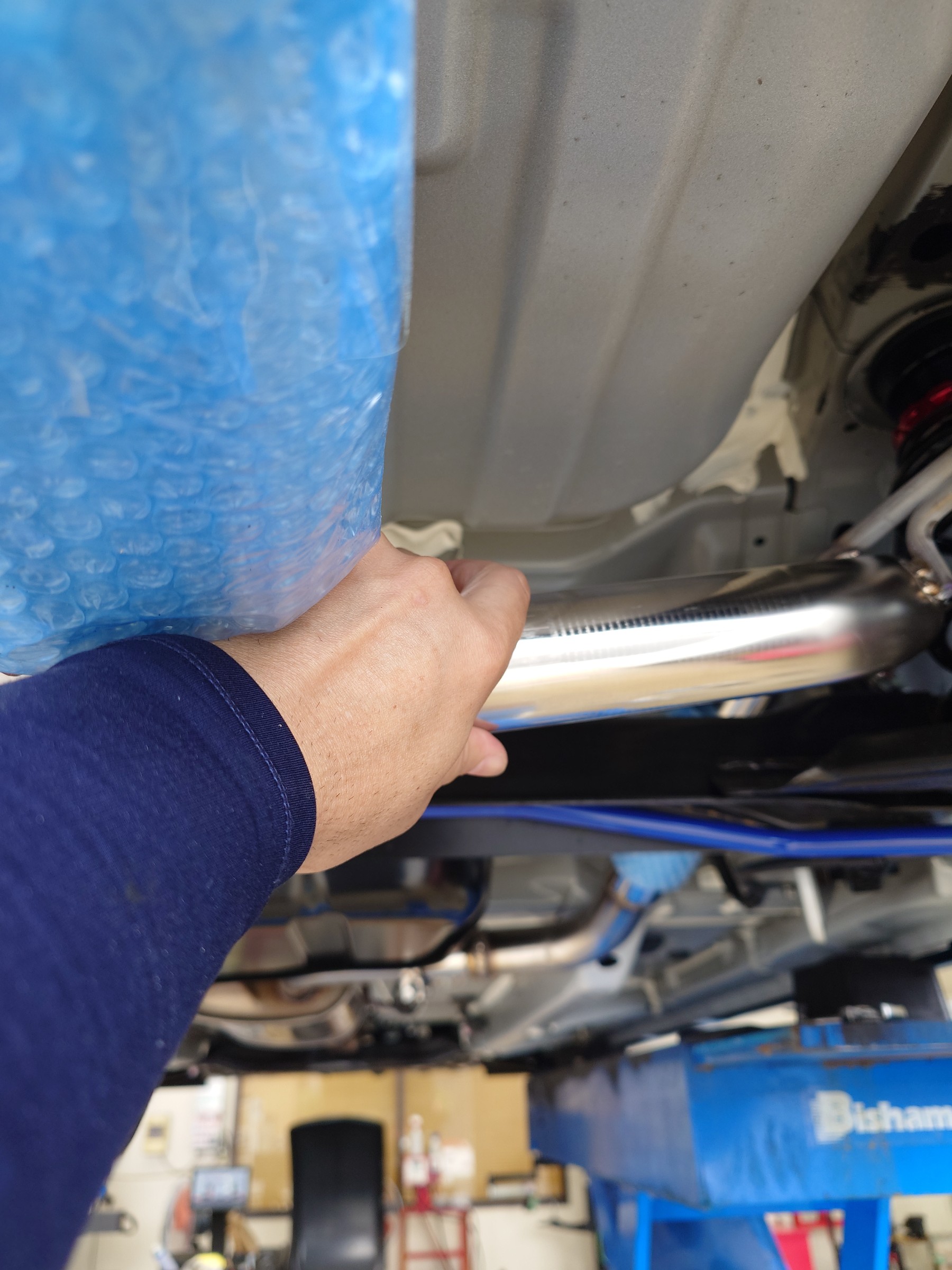 カットした純正マフラーを戻してブリッツ ニュルスペックカスタムエディションを仮付けしていきます