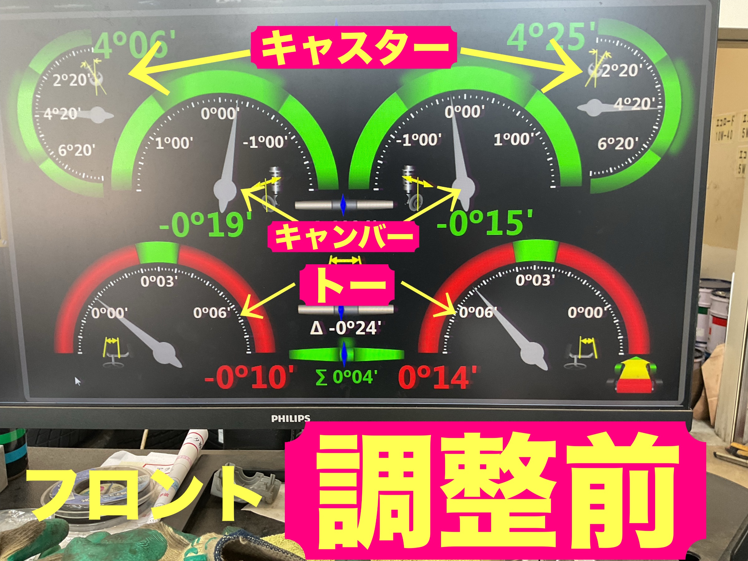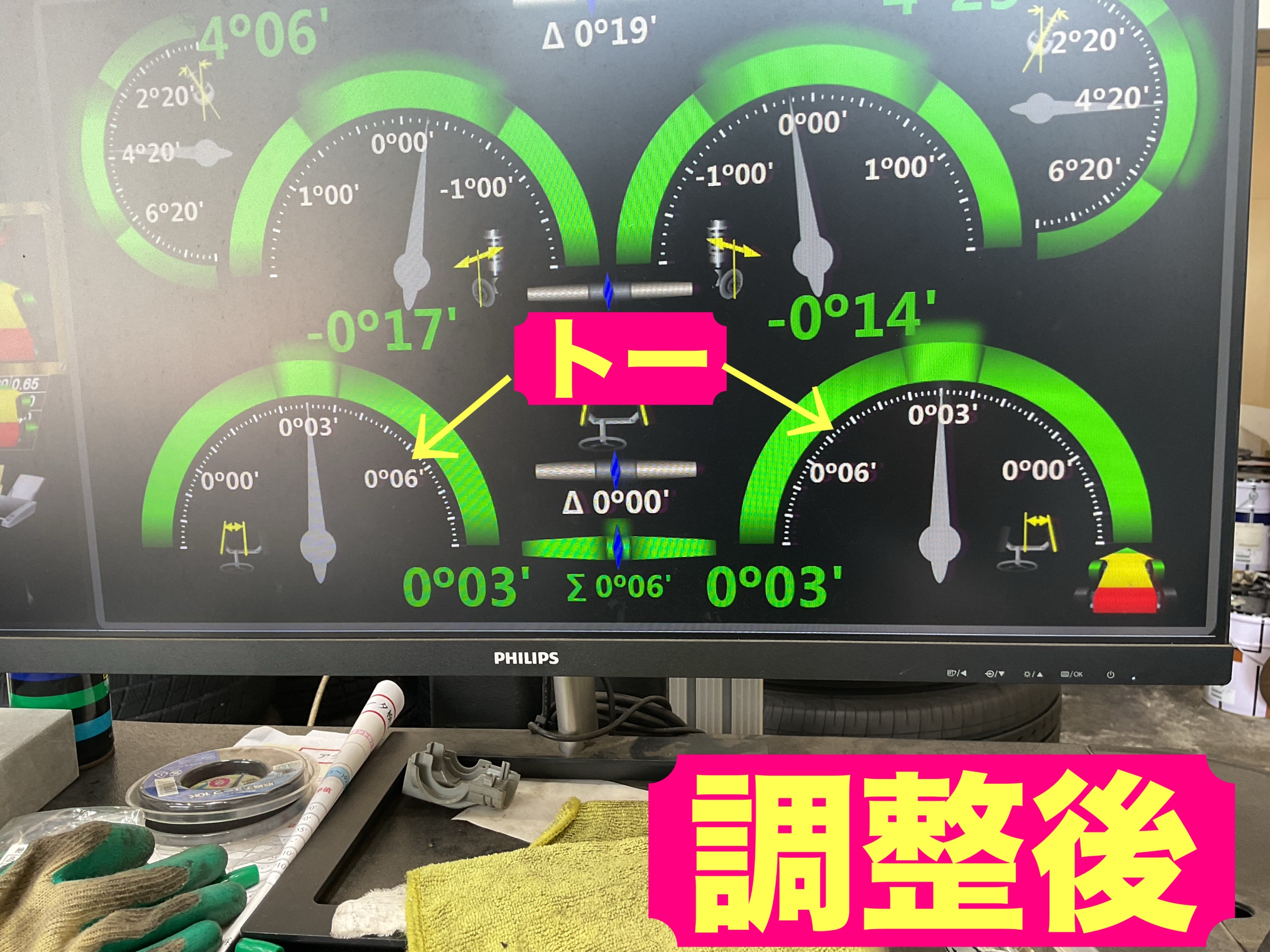 トーが左右とも左にずれていますね。。ハンドルセンターズレってやつですね(/・ω・)/
