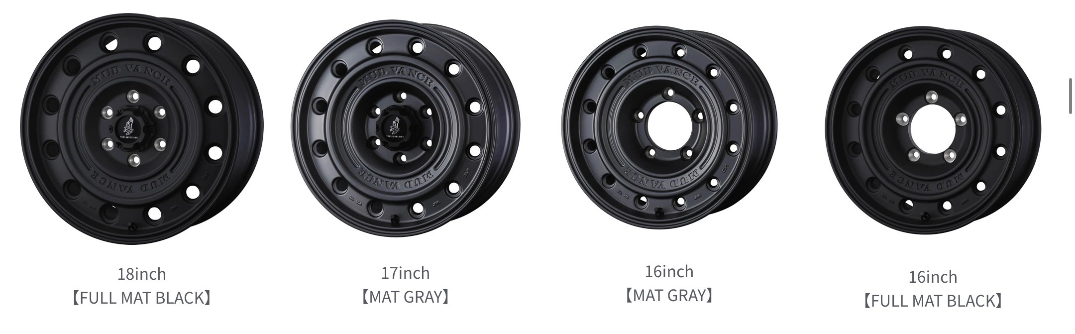 12inchから20inchまでのフルサイズ設定で、SUV、4WD、トランスポーター軽自動車まで多くの車両に適合する