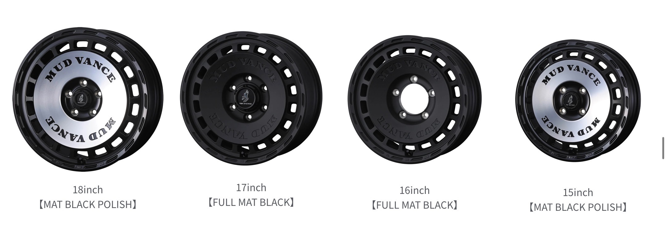 センターへ向けて強くコンケイブを効かせたディッシュタイプホイールセンターディッシュ部には【MUDVANCE】のロゴを入れることで強烈なインパクトを持ち合わせたデザイン