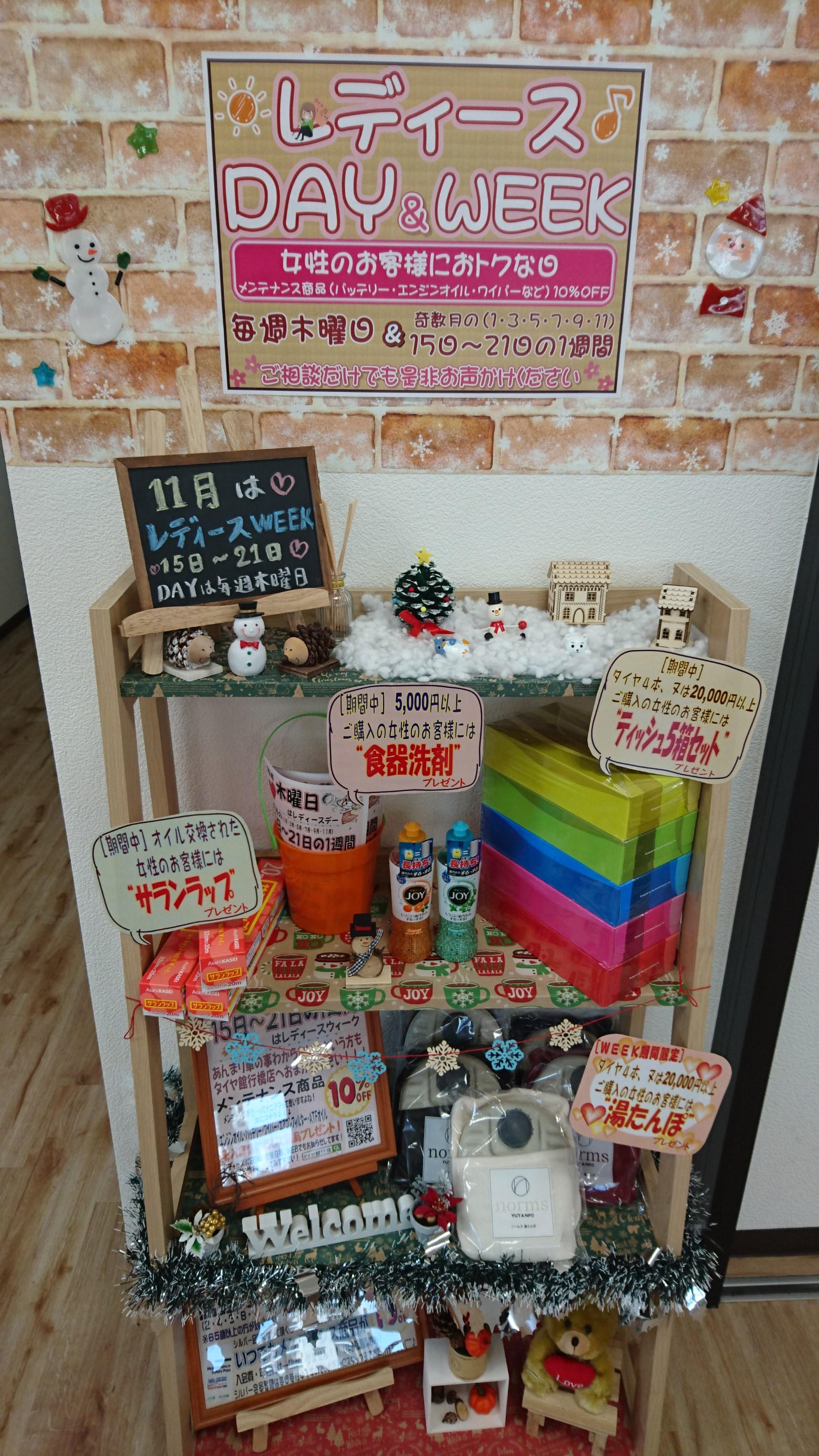 ✧*。女性にお得な一週間✧*。 ポスト 2017年11月13日 こんにちは~ ⋆* ⁑⋆*タイヤ館 行橋店⋆* ⁑⋆*です 今年最後の女性にお得な一週間 レディースWEEKが始まります(。◕ ∀ ◕。) 期間は15日(水)~21日(火)です。 メンテナンス商品(オイル・バッテリー・ワイパー等) がお得なこの期間、お茶菓子もご用意してます♡ ぜひ、ご来店下さい~( ˘͈ ᵕ ˘͈ )♪ 担当:シマヅ