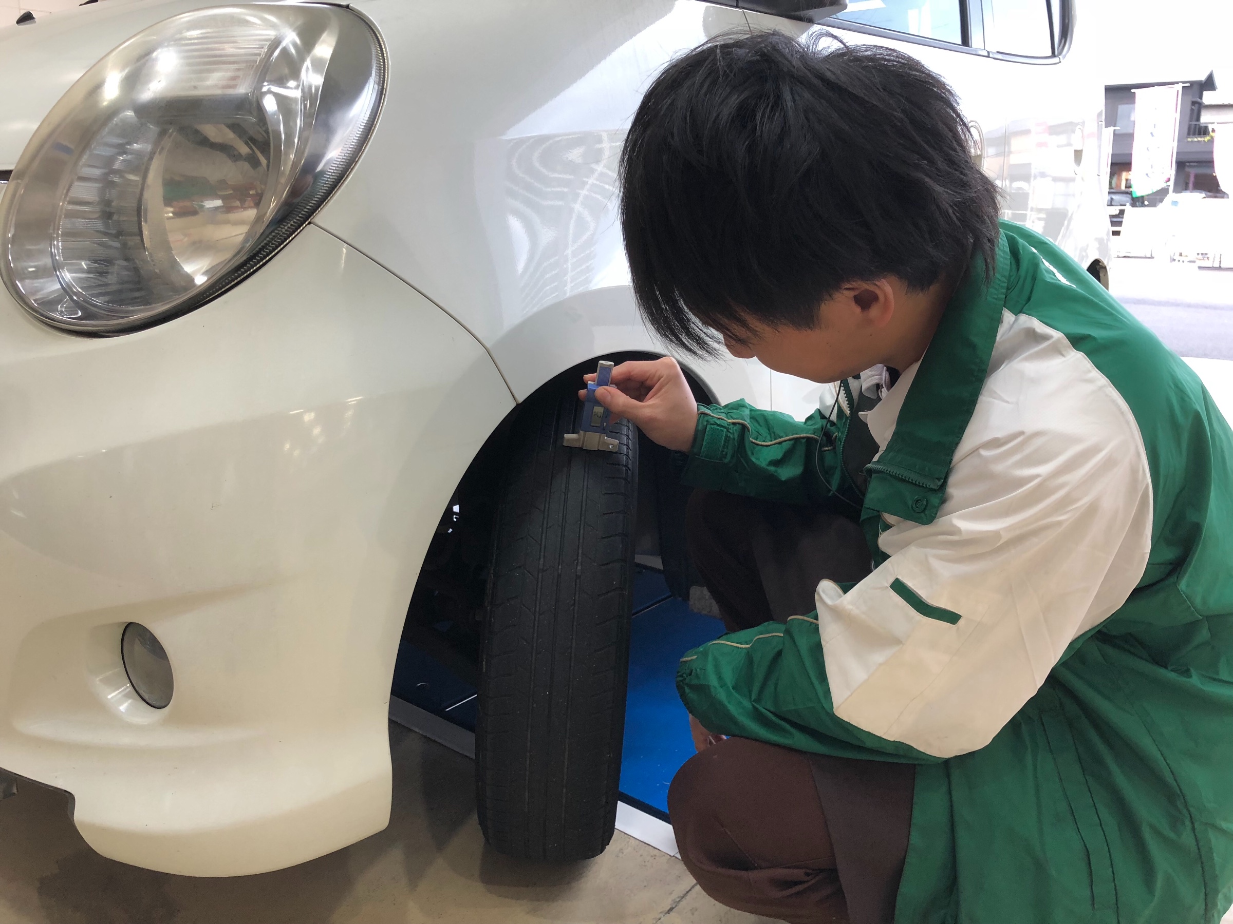 デプスゲージというタイヤの溝を図る器具を使ってミリ単位の変化をしっかり確認して、お客様のタイヤの状況をチェックします。