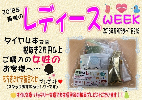 明日から1週間レディースWEEK∗.♪ ポスト 2018年11月14日 こんにちは!! タイヤ館行橋店の江﨑です! 明日から1週間。o+゚+* 11月 15日(木)~21日(水)は レディースWEEKです|ૂ•ᴗ•⸝⸝)” 女性のお客様にお得な1週間です☆ メンテナンス商品(オイル・ワイパー・バッテリー等) 10%OFF~!! 今年最後のレディースWEEKになりますので この機会に是非お越しください( *ˊᵕˋ )/ 担当:江﨑
